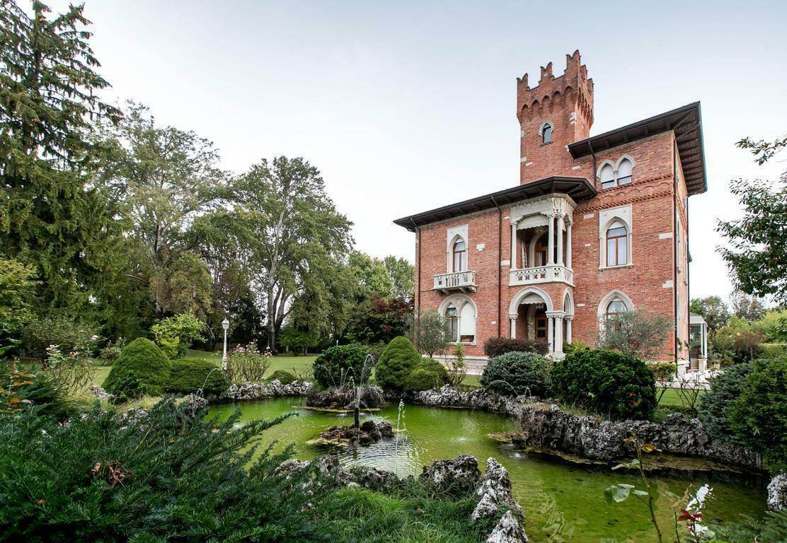 The eclectic architecture of the property is inspired by the Tuscan Renaissance style, with exposed masonry and white stone cornices that accentuate the Gothic-inspired windows. The tower rising above the two-story building encloses a small terrace accessible from the inside. In addition to five bedrooms and four bathrooms, the main house has a kitchen, a dining room, a living room, a study, a library, a gallery and storage rooms on an area of approximately 960 m².
