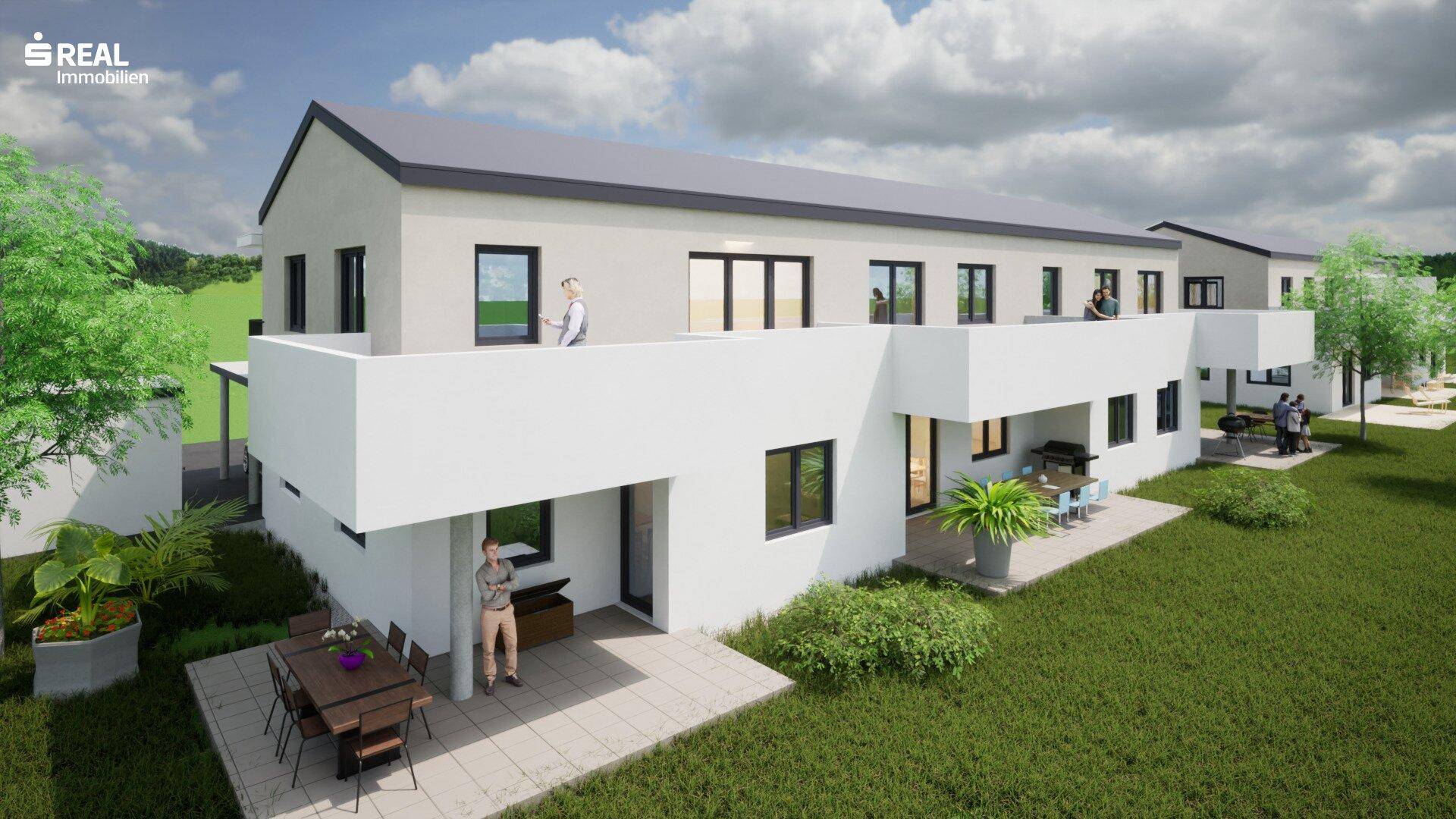 Die südöstlich ausgerichteten Wohnungen bieten entweder eine großzügige Terrasse mit Eigengarten im Erdgeschoß oder einen sonnigen Balkon im Obergeschoß. Alle Einheiten verfügen über durchdachte Grundrisse und hochwertige Ausstattungsmerkmale. Zu jeder Wohnung gehört ein überdachter Autoabstellplatz sowie ein ebenerdiger Abstellraum. Darüber hinaus steht pro Wohneinheit ein eigener Besucherparkplatz zur Verfügung. Die Geschoße des Hauses werden über eine überdachte Außenstiege mit Laubengang erschlossen – funktional und architektonisch ansprechend gelöst.