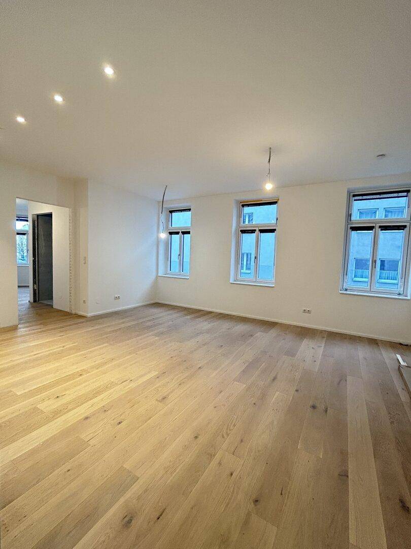 Über den Vorraum betritt man die komplett sanierte 58,28 m2 große Wohnung. Direkt vis à vis vom Eingang befindet sich die Garderobe, die genügend Platz für einen Kasten bietet und von wo man auch zum WC gelangt. Vom Vorraum aus erstreckt sich zur Rechten die Kochnische, wo auch der Waschmaschinenanschluss zu finden ist und alle Anschlüsse für eine Küchenzeile vorbereitet sind. Im anschließenden Wohnraum mit knapp 23 m2 kann sowohl ein Essbereich als auch ein gemütlicher Wohnbereich mit Couch und Sideboard gestaltet werden. Der angrenzende Schlafbereich mit viel Tageslicht bietet auf über 16 m2 genügend Raum für ein komfortables Doppelbett als auch einen Kleiderschrank. Das Badezimmer mit Waschtisch, Dusche und Tageslichtfenster ist direkt über den Schlafraum erreichbar und hochwertig ausgestattet.