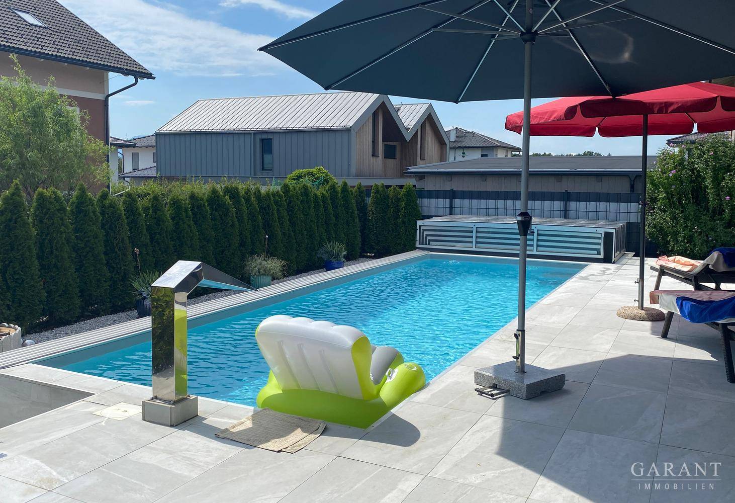 Das Grundstück verfügt über einen gepflegten Außenbereich mit einer Süd/Ost-Terrasse, eine überdachte Lounge und einem 9x3 m großen Salzwasserpool mit Überdachung, der durch eine Wärmepumpe beheizt wird. Eine Zisterne bietet die Möglichkeit zur Regenwassernutzung.