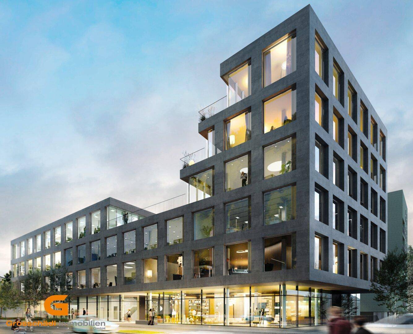 Im Erdgeschoß befinden sich Geschäfts- und Gastroflächen, darüberliegend Büroflächen.