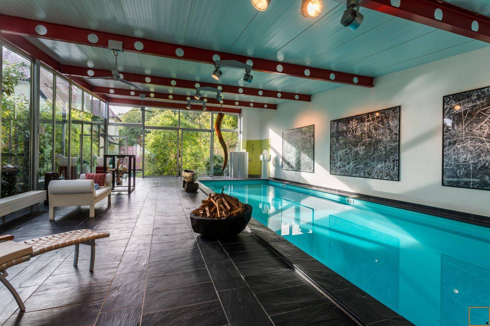 Direkt an das Haupthaus angeschlossen befindet sich eine große Schwimmhalle mit einem 60 m² großen Pool, ein Dampfbad, ein Fitnessbereich und ein Weinkeller. Im Garten ist zusätzlich eine ehemalige Kegelbahn situiert. Das Gästehaus bietet Platz für eine weitere Familie und verfügt auf rund 140 m² über einen Salon, eine Küche, drei WCs und ein großes Badezimmer. Das Gärtnerhaus hat rund 80 m² und ist mit Dusche und WC ausgestattet, auch hier ist der Dachboden ausgebaut.