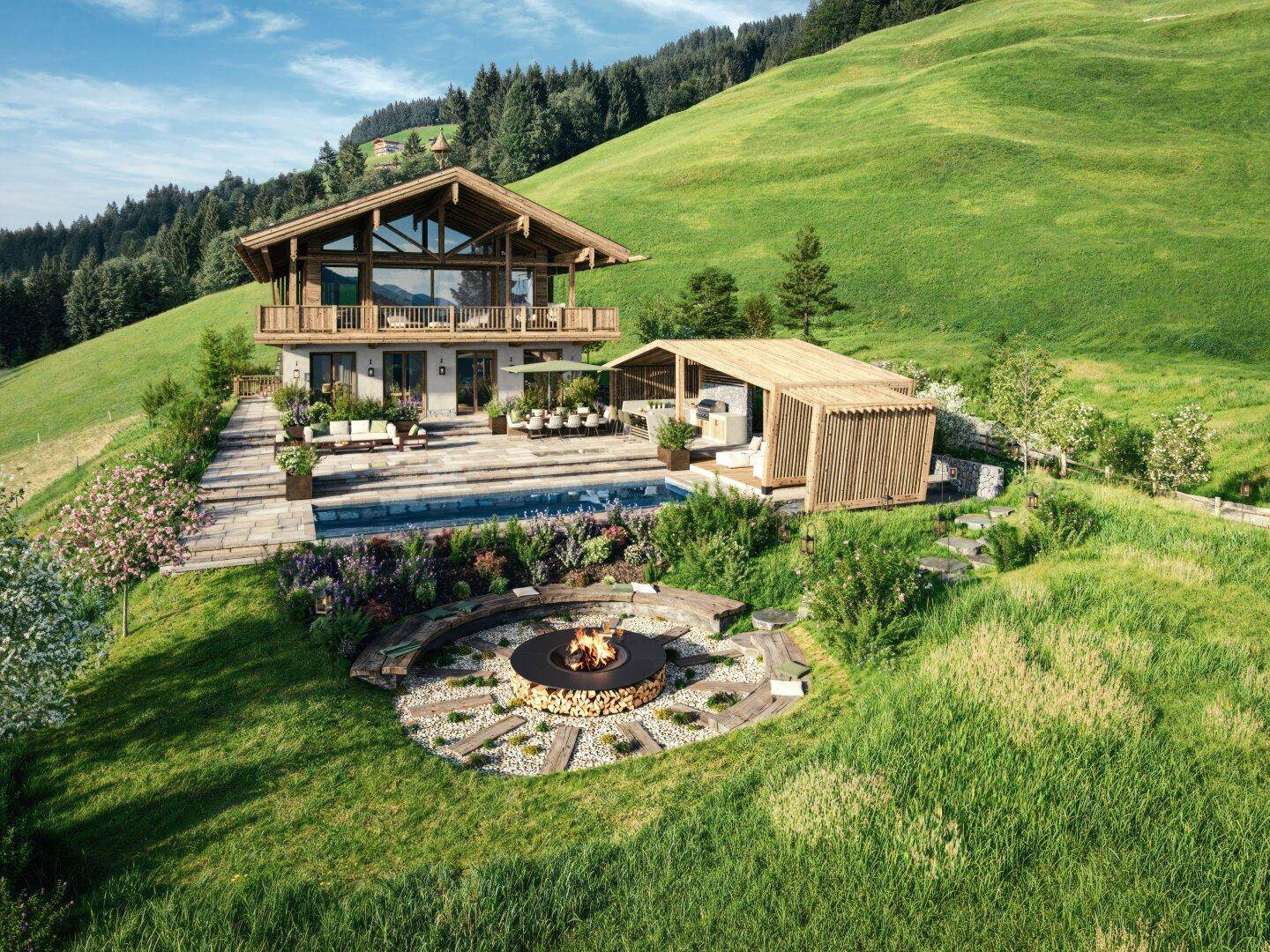 Die Liegenschaft genießt aufgrund ihrer Ausrichtung ganztägig Sonne – im Sommer wie auch im Winter. Daher wurden großzügige Außenbereiche mit Outdoor Infinity Pool, Poolhaus Outdoor Küche und zahlreichen Terrassen zum Sonnenbaden geplant.