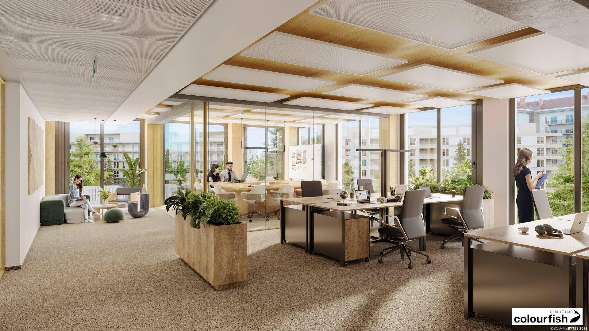 Hohe Decken, natürliche Holzoberflächen und eine flexible Raumaufteilung bieten die besten Voraussetzungen für maßgeschneiderte Bürokonzepte. Moderne Heiz- und Kühlsegel-Technologie sorgt für angenehme thermische Behaglichkeit, während Stehleuchten mit direktem und indirektem Lichtanteil zu jeder Tageszeit optimale Beleuchtung gewährleisten.