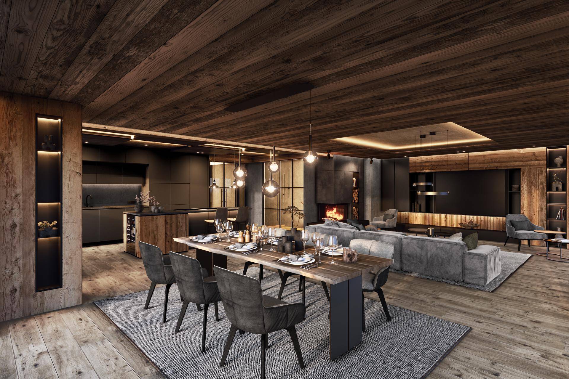 Die Maisonette beeindruckt durch ihre erstklassige Ausstattung und das durchdachte Design. Das Interieur verbindet rustikale Elemente wie Altholz und Stein mit modernem Komfort. Die offene Küche ist das Herzstück des Wohnbereichs und ist perfekt für gesellige Abende. Die großen Fensterfronten schaffen eine nahtlose Verbindung zur Natur und bieten spektakuläre Ausblicke. Der private Masterbereich verfügt über ein eigenes Spa mit Sauna, und die Terrasse mit Außenjacuzzi lädt zum Entspannen ein. Die hochwertige Innenausstattung, wie auf den Visualisierungen dargestellt, ist im Kaufpreis inbegriffen.