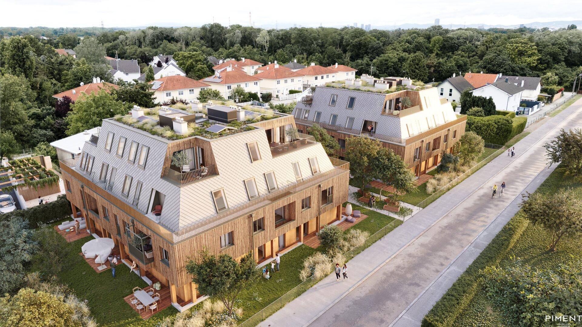 DER GARTEN ALS TREFFPUNKTDer zentrale Gemeinschaftsgarten bietet nicht nur Raum für Begegnungen und Entspannung, sondern auch Platz für Urban Gardening: saisonal, regional und kommunikativ. Das „Garteln“ ergänzt unser Konzept zeitgemäßen Wohnens und lädt zum gemeinschaftlichen Pflanzen, Pflegen und Ernten ein. Die naturbelassenen Flächen und die harmonisch integrierten Gärten lassen Sie die Jahreszeiten und Zyklen der Natur spürbar erleben. Die Farbgestaltung orientiert sich an naturnahen Tönen, während die Holzfassade in den unteren Stockwerken durch eine Metallfassade bei den geneigten Wänden und Dachschrägen ergänzt wird. Innen dominieren weiß lackierte Holzoberflächen, die das naturnahe Ambiente unterstreichen.