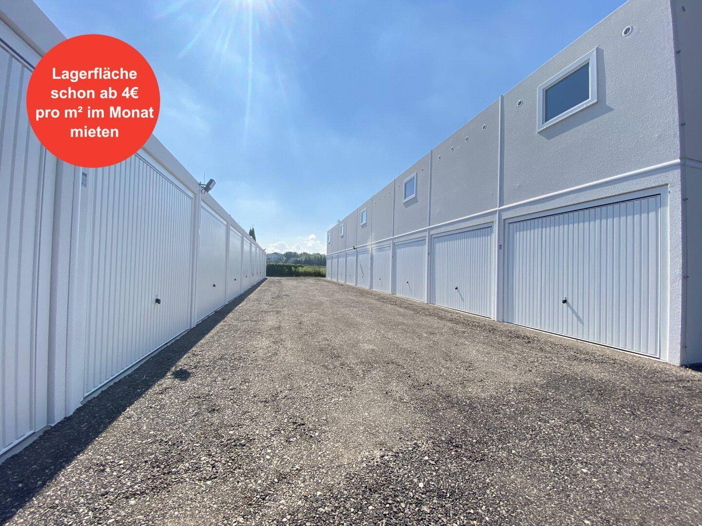Elektrisches Tor mit Funkhandsender (bei Garagen), Vollbeton Boden, 8 cm Wandstärke, Außenputz, Dispersionsbeschichtung an Wand und Decke, Stromanschluss u. Licht, 24h Zugang.