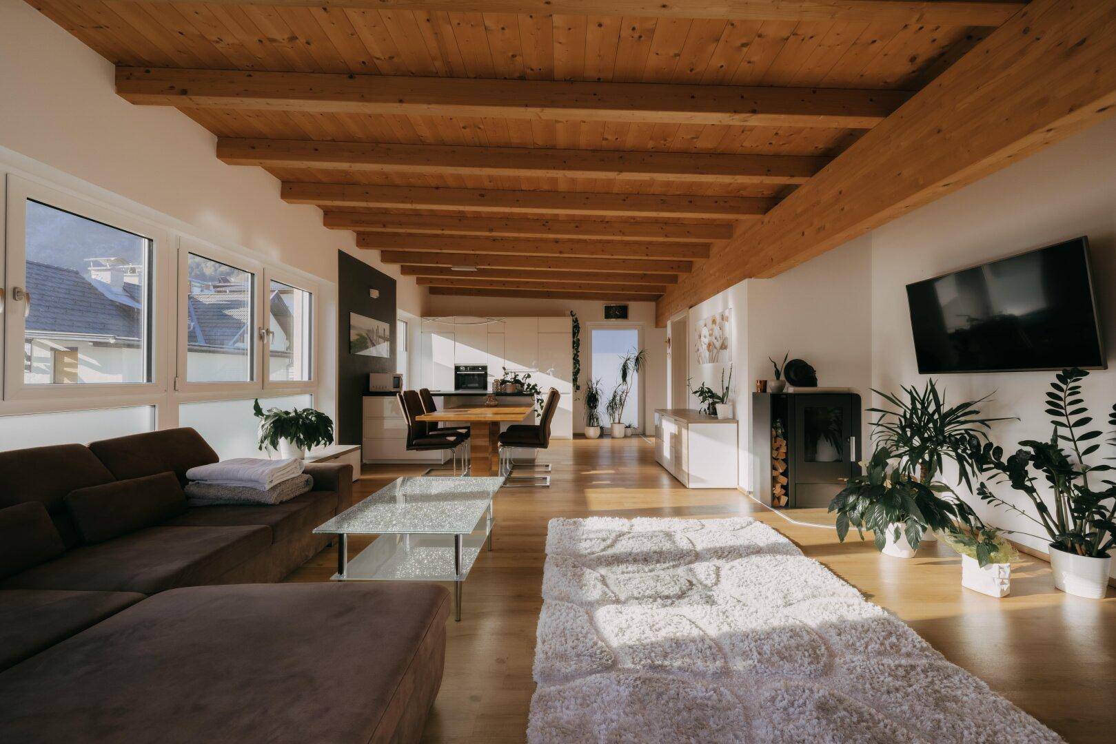 Das Erdgeschoss dieser Immobilie ist ein perfekter Rückzugsort für Familien, die das Leben in vollen Zügen genießen möchten. Der offen gestaltete Wohn / Essbereich bildet das Herzstück des Zuhauses. Die exklusive Einbauküche, mit hochwertigen Materialien und modernster Technik ausgestattet, lädt dazu ein, kulinarische Highlights zu zaubern und gemeinsame Mahlzeiten zu genießen. Die Sichtbetondecke mit integrierten Leuchten verleiht dem Raum einen modernen, stilvollen Charakter.