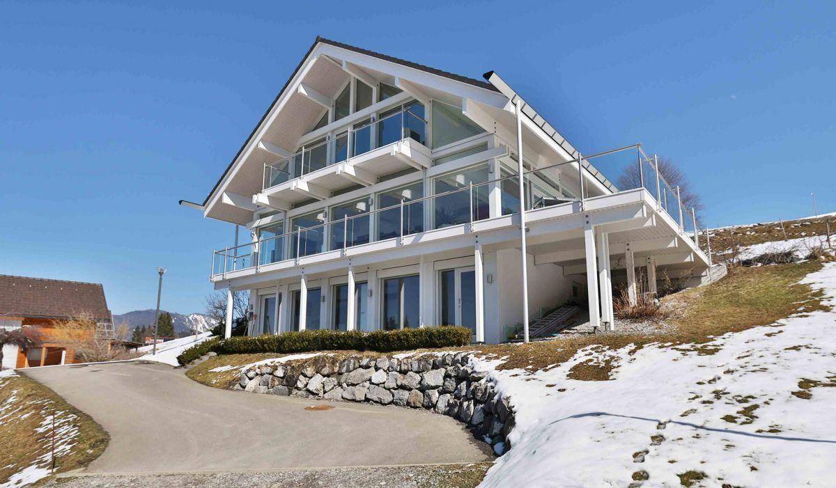 Das moderne Design trifft Ruhe, Natur und Erholung in alpiner Umgebung! Im Jahr 2007 wurde dieses Haus hoch über dem Vorarlberger Rheintal im Bergdorf Furx auf 1.100 Meter Seehöhe errichtet. Seine in weiß, Edelstahl und Glas gehaltene Fassade strahlt hell wie ein Schneekristall aus der Umgebung heraus. Auch die Innengestaltung führt dieses Konzept der Helligkeit und Leichtigkeit fort. Warme Kontraste werden durch dunkle, edle Hölzer und Einrichtungsgegenstände in freundlichen Farben als Akzente gesetzt, welche in der Kombination eine behagliche Atmosphäre entstehen lassen.