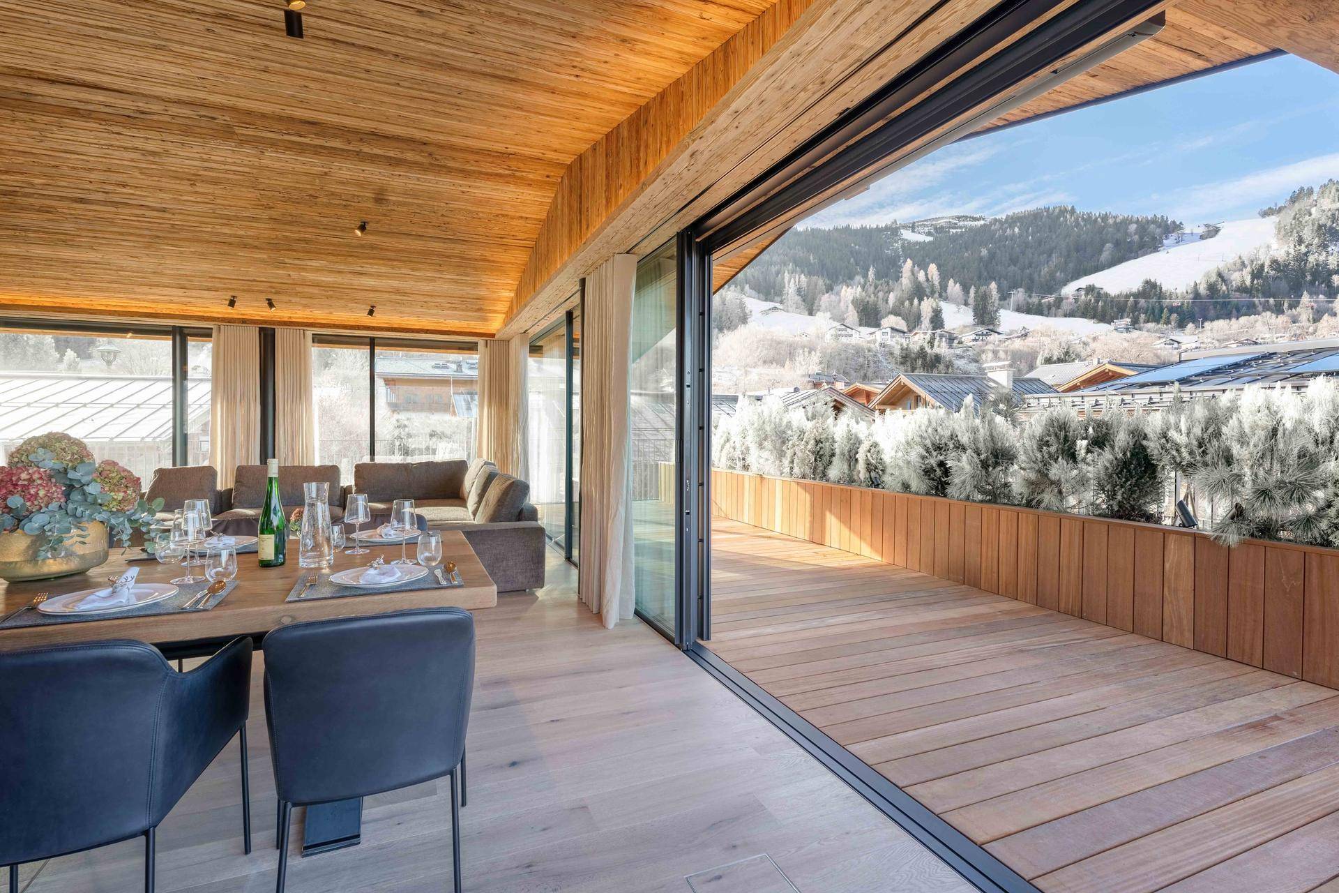 Die Bauweise vereint auf elegante Weise modernes Design mit klassischen alpinen Stilelementen, während hochwertige Materialien wie edle Hölzer und Naturstein eine warme, einladende Wohnatmosphäre schaffen.