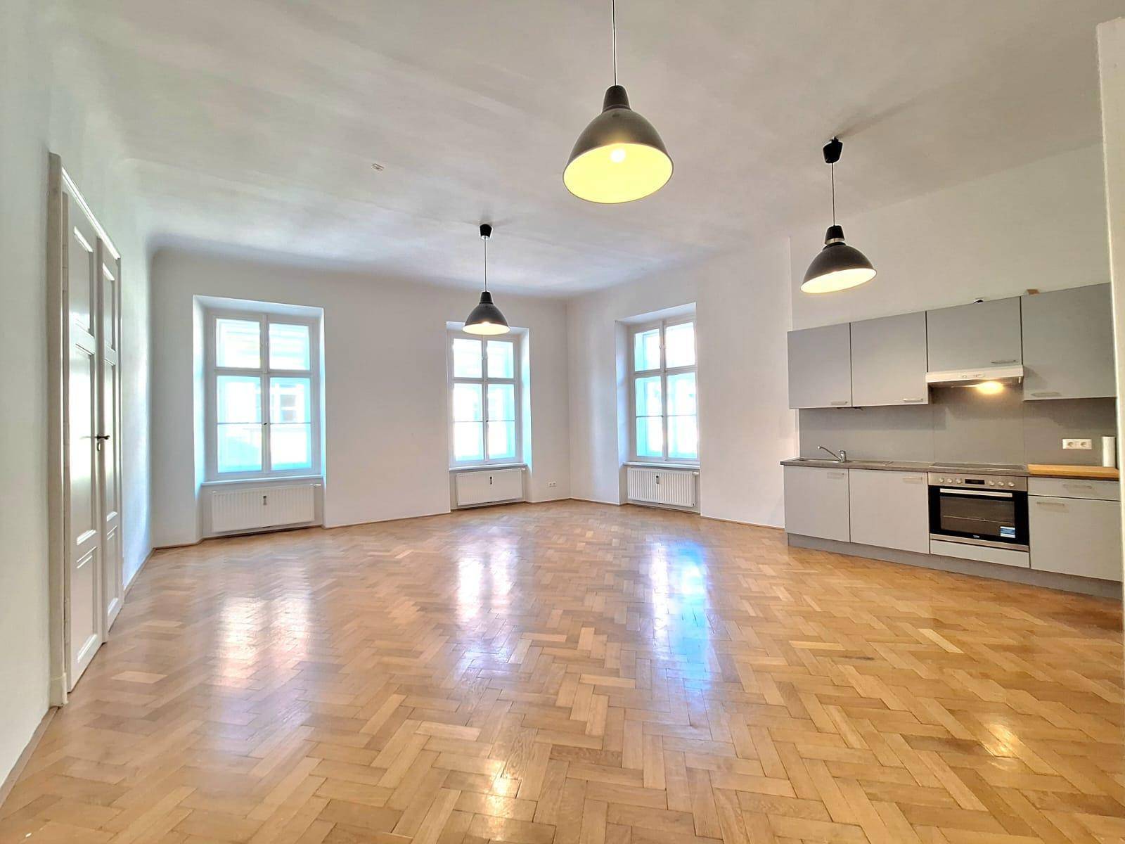 Die Wohnung besteht aus einer großzügigen Openspace Wohnküche, die sowohl auf die beliebte Sporgasse als auch auf die Färbergasse ausgerichtet ist. Die hohen Wohnräume und der stilvolle Parkett verleihen dem gesamten Ambiente einen eleganten Altbau Charme.