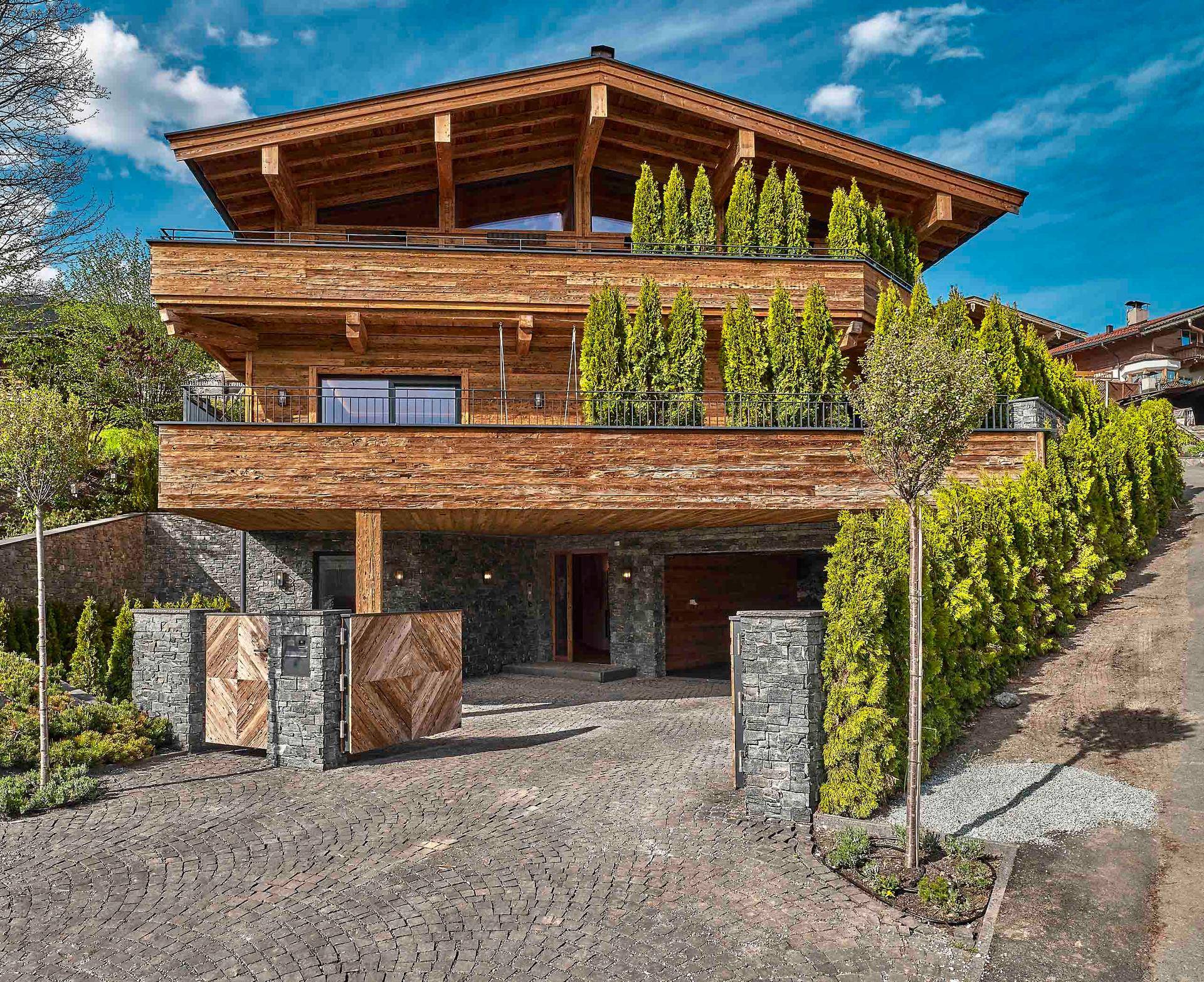 Die Verwendung von edelsten Naturmaterialien wie gehacktes Altholz, Naturstein, feinste Fliesen und Glas verleihen dem Chalet seinen sehr ansprechenden, zeitgemäßen und luxuriösen Chalet-Charakter.