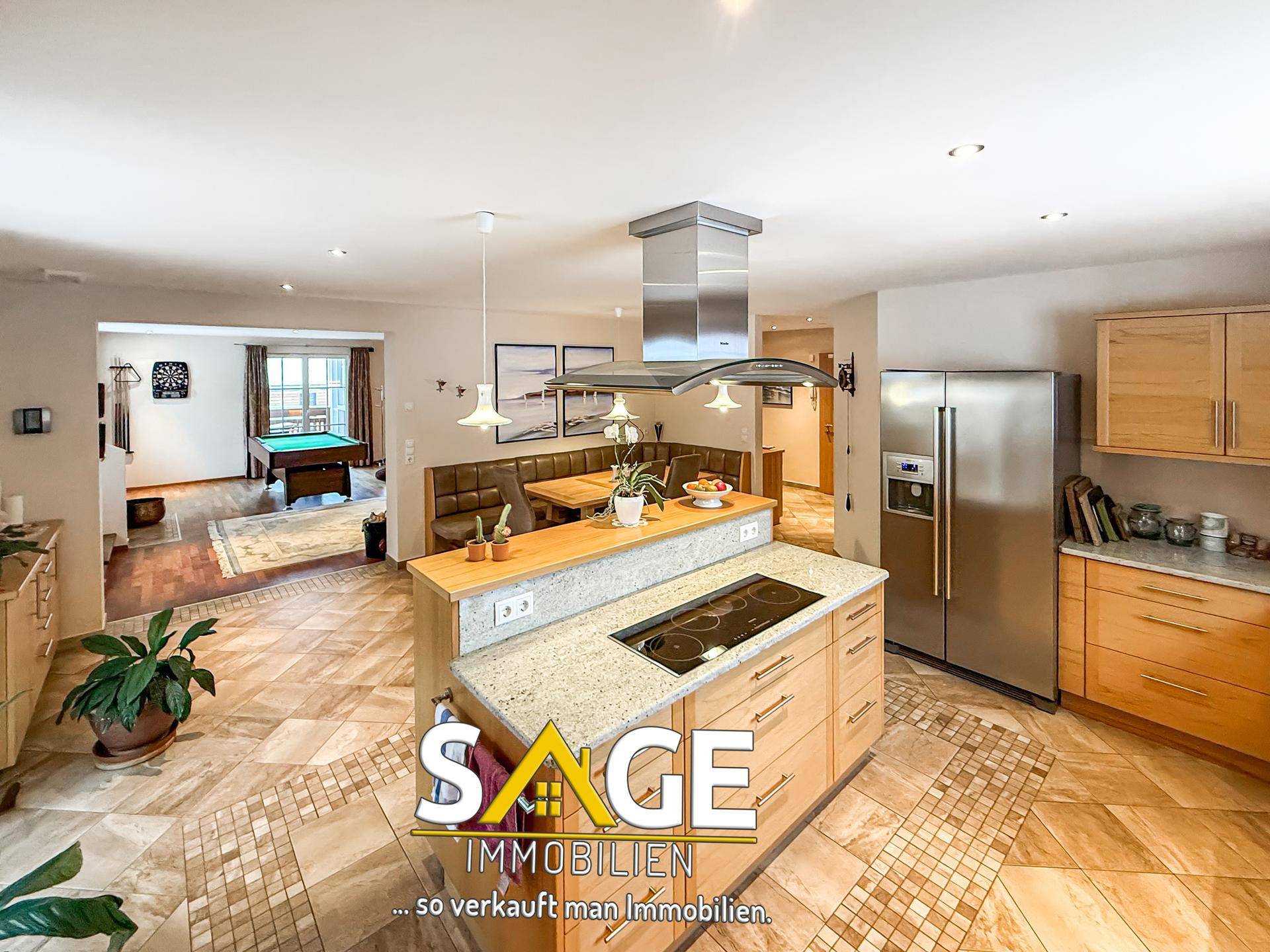 Im Erdgeschoss führt ein weiterer Zugang vom Treppenhaus in die Diele mit angrenzendem Gäste-WC und einem hellen Büro. Die moderne Küche ist mit einem keramischen Kochfeld, Backofen, Mikrowelle, einem großzügigen Kühlschrank mit Gefrierfach sowie einem kleinen Weinkühlschrank ausgestattet. Der angrenzende Essbereich führt direkt auf die Terrasse mit Pool. Das große Wohnzimmer bietet eine behagliche Sofaecke, einen Schwedenofen, einen Billardtisch sowie eine Dartanlage und hat Zugang zum Balkon. Die Flächen betragen 42 m² für Küche und Diele, 58 m² für das Wohnzimmer, 3 m² für das Gäste-WC und 9 m² für das Büro.