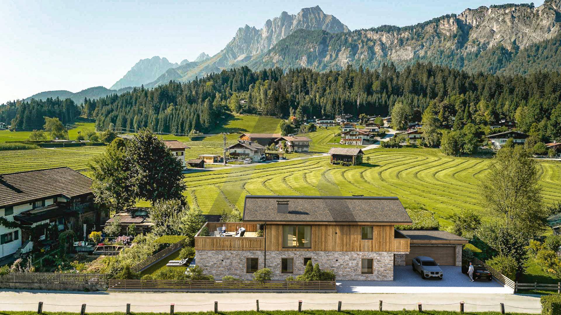 Die Lage bietet einen herrlichen Blick auf den Wilden Kaiser, sowie auf das Kitzbüheler Horn.