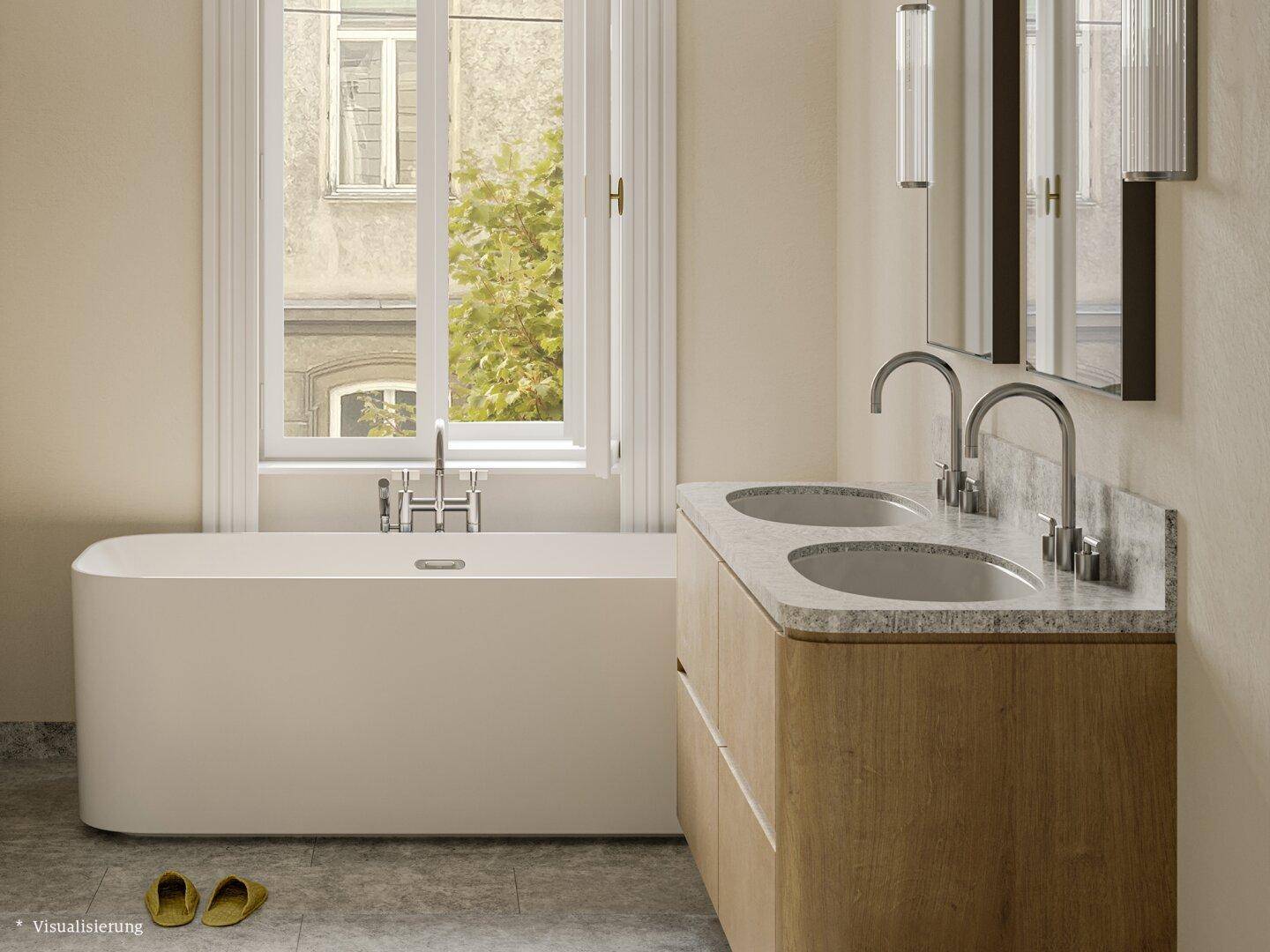 Neu eingesetzte Kastenfenster und profilierte Stiltüren tragen zum traditionellen Charakter der Wohnung bei. Im Badezimmer befinden sich exklusive Waschtischmöbel mit Spiegelschränken und Leuchten, die Funktionalität und Ästhetik vereinen.