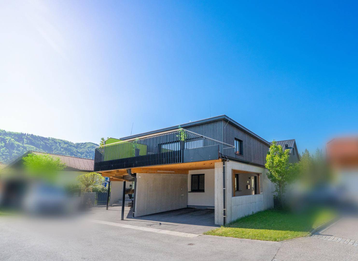 Besondere Highlights des Hauses sind die überdimensional großen Fensterfronten mit 3-fach-Verglasung, die nicht nur für lichtdurchflutete Wohnräume sorgen, sondern auch Energieeffizienz garantieren. Die Raumaufteilung ist ideal für ein Paar, das modernes Wohnen mit der Möglichkeit zum Arbeiten von zu Hause verbinden möchte. Die sonnige, große Holzterrasse bietet einen traumhaften Ausblick auf die Berge und viel Raum zur Erholung in der Natur.