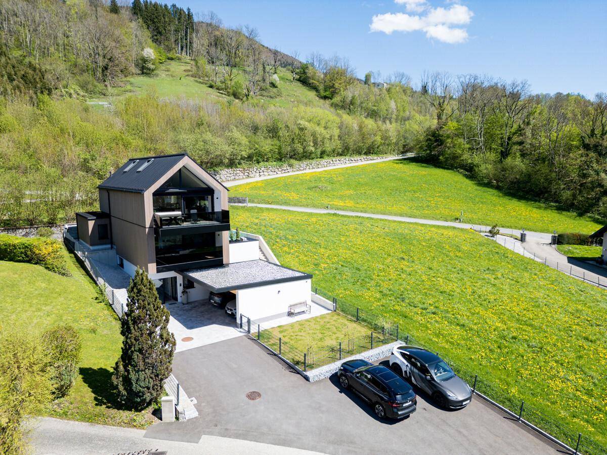 Ein architektonisches Highlight der Villa ist das Dachgeschoss: Mit offener Raumhöhe, großflächiger Verglasung und fließenden Übergängen zwischen Innen- und Außenraum entfaltet sich hier der lichtdurchflutete Wohn- und Essbereich. Genießen Sie atemberaubende Ausblicke auf den Mondsee, majestätische Berggipfel sowie grüne Wiesen und Baumlandschaften. Die maßgefertigte Tischlerküche mit hochwertigen Geräten und edlen Oberflächen ist das Herzstück dieser Etage – ein Ort für kulinarische Entfaltung und geselliges Beisammensein. Die angeschlossene Terrasse erweitert den Wohnraum und macht das Naturerlebnis jeden Tag aufs Neue spürbar. Alle Ebenen der Villa können auf Wunsch über einen modernen 1-Personen-Lift verbunden werden – die räumliche Vorbereitung für dieses komfortable Plus ist bereits vorhanden und zukunftsweisend mitgedacht. Das Carport bietet Platz für zwei Fahrzeuge und verfügt über einen eigenen E-Ladeanschluss.