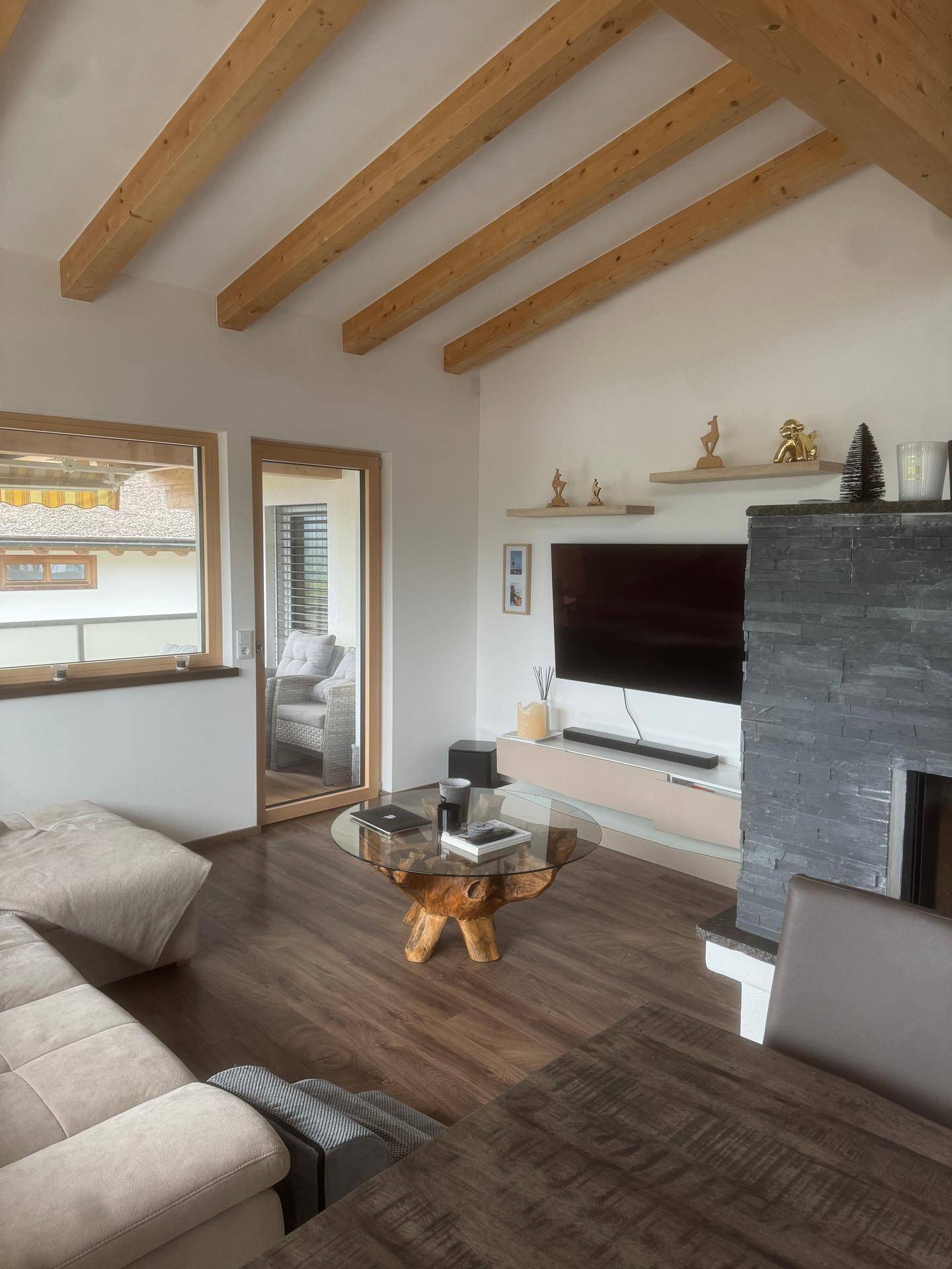 Offen gestaltete, moderne Dachgeschosswohnung mit Sichtdachstuhl und hohen Räumen. Baujahr: 2017 mit hochwertiger Ausstattung direkt am Wilden Kaiser. Die Wohnung überzeugt durch Aussicht und Stil.