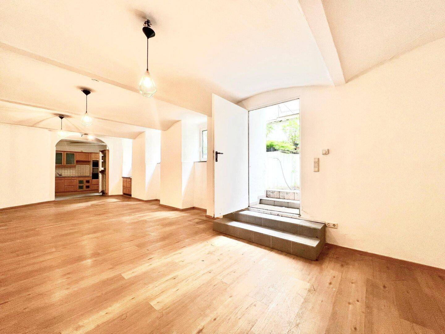 Der Zugang erfolgt über wenige Stufen direkt vom Innenhof. Der große Hauptraum mit Gewölbedecke und mehreren Fenstern bietet flexible Nutzungsmöglichkeiten. Zusätzlich stehen eine voll ausgestattete Küche sowie ein Badezimmer mit Dusche, Waschbecken und WC zur Verfügung.