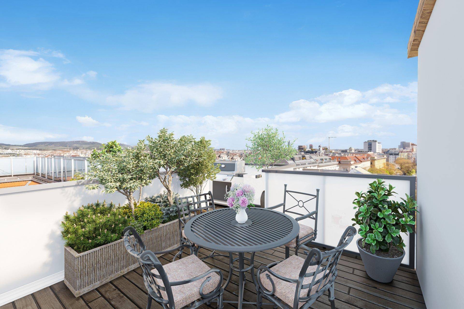 Gelegen in einer der begehrtesten Lagen Wiens, nur einen Steinwurf vom historischen 1. Bezirk entfernt, bietet diese außergewöhnliche, sehr elegant und hochwertig ausgestattete 5-Zimmer-Wohnung mit einer Wohnfläche von rund 295 m² und Terrassenflächen von rund 78 m² ein Raumgefühl, wie man es sonst nur in eine Architektenvilla erlebt, verbunden mit dem exklusiven Flair einer Dachgeschoss-Wohnung und spektakulär schönen Ausblicken über die Wiener Innenstadt. Eine massive, offene Innentreppe verbindet eindrucksvoll die zwei Wohnebenen und führt bis zur Dachebene, wo eine große imposante Lichtkuppel viel Licht einfallen lässt und den Blick in den Himmel freigibt. Breite, teils auch bodentiefe Fenster- und Glasfronten auf der Wohnebene sorgen für Helligkeit und, nicht zuletzt dank der großen Raumhöhen und geringen Dachschrägen, für ein freies und großzügiges Wohngefühl. Die untere Ebene umfasst neben dem repräsentativen Foyer mit Zugang zum begrünten Balkon das Hauptschlafzimmer mit Bad en suite und Dampfbad, einen Schrankraum sowie zwei weitere Schlafzimmer mit zwei weiteren Bädern. Alle Schlafräume und Bäder sind großflächig konzipiert und gleichermaßen stilvoll und komfortabel ausgestattet. Die darüber liegende Ebene umfasst mehrere geschmackvolle Wohnbereiche mit komfortablen Sitzlandschaften, einen Essbereich mit ausreichend Platz für größere Gesellschaften, eine auffällige Design-Küche, eine Gästetoilette, ein Büro, das sich als viertes Schlafzimmer nutzen ließe, sowie den Zugang zu zwei Terrassen von rund 16 m² bzw. 10 m² Fläche. Über die massive, sich wie ein Eye-Catcher zentral durch die Immobilie hochziehende Innentreppe erreichen Sie die rund 45 m² große Dachterrasse - aktuell in Barbecue-Zone und Lounge-Zone aufgeteilt. Der Blick: eindrucksvoll, weit, frei und unverbaut. Stilvolle Parkettböden, elegante Vollholztüren und großflächige Einbauschränke sowie die exquisite Designer-Küche prägen das Gesamterscheinungsbild der Immobilie. Fenster mit Isolierverglasung, die als Sicherheitstür ausgestaltete Wohnungseingangstür, eine Alarmanlage, neuwertige Haustechnik, Fußbodenheizung sowie Klimaanlage sorgen für Komfort und Sicherheit. Selbstverständlich parken Sie Ihr Fahrzeug auf dem zugehörigen Stellplatz in der hauseigenen Garage (Kaufpreis Euro 70.000), die Sie, wie auch den Kellerraum, bequem per Aufzug erreichen. Aktuell ist die Immobilie mit hochwertiger Designer-Einrichtung renommierter internationaler Marken ausgestattet. Auf allen Terrassen finden Sie opulente Bepflanzungen und Hecken, die absolute Privatsphäre ermöglichen, Grünblick mitten in der Stadt und den Luxus vom privaten Garten am Dach bieten.