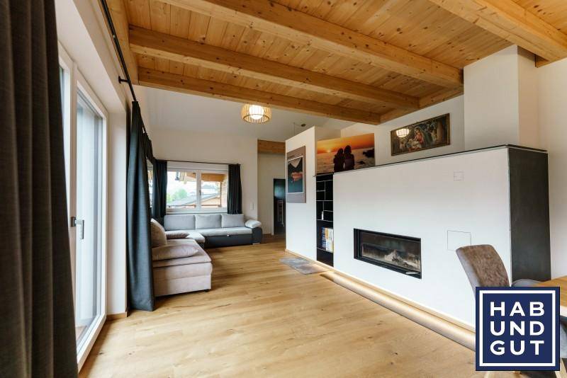 Beim Betreten der Wohnung gelangt man direkt in den Masterbedroom, welcher mit einem großzügigen Badezimmer ausgestattet ist. Der Wohnessbereich verfügt über eine moderne Küche mit hochwertigen Geräten, einen großzügigen Esstisch sowie einen offenen Kamin-Kachelofen. Zwei weitere Schlafzimmer mit angeschlossenem Bad und WC runden diese besondere Liegenschaft ab.