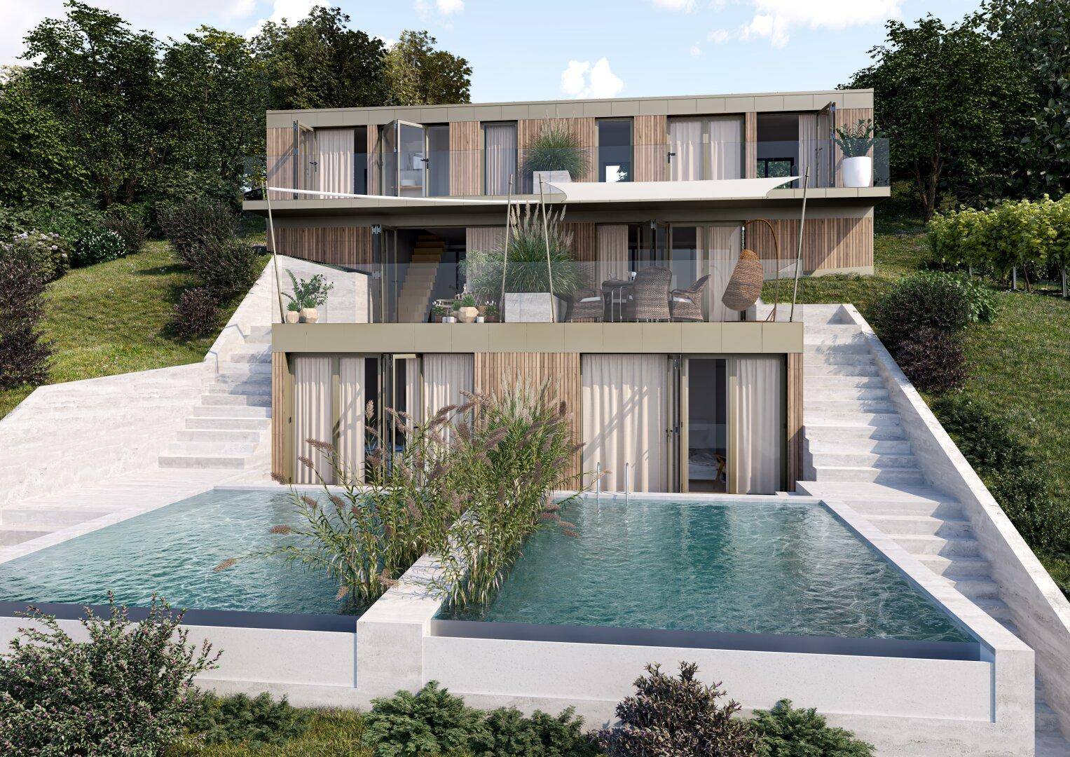 Die Doppelhaushälften faszinieren nicht nur durch ihr optisches Erscheinungsbild, sondern beeindrucken zudem mit ihren Annehmlichkeiten, wie einer privaten Sauna, einem Außenpool und großzügigen Freiflächen. Dieser Kraftplatz bietet eine willkommene Abwechslung zu Hektik und Trubel des Wiener Stadtlebens und vermittelt ein entspanntes Urlaubsgefühl am Rande von Wien. Der berühmte Heurige "Mayer am Nußberg" ist nur einen kurzen Spaziergang von der Liegenschaft entfernt. Genießen Sie ein Gläschen Wein mit Blick über die grünen Hügel und das schöne Panorama Wiens.