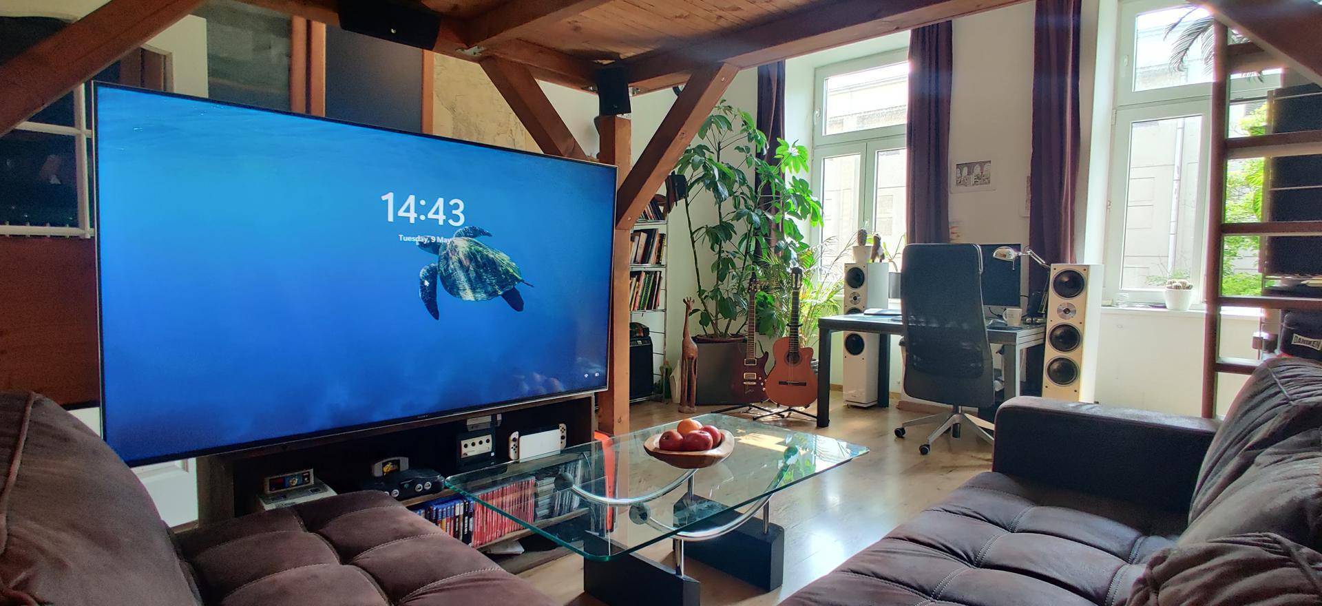 Betreten Sie das geräumige Wohnzimmer, in dem Sie einen 70-Zoll-Flachbildfernseher und ein doppeltes Surround-Kinosystem finden – perfekt für Filmabende und immersive Unterhaltung. Der Raum ist mit einer Vielzahl von üppigen Pflanzen geschmückt, die eine ruhige und erfrischende Atmosphäre schaffen.