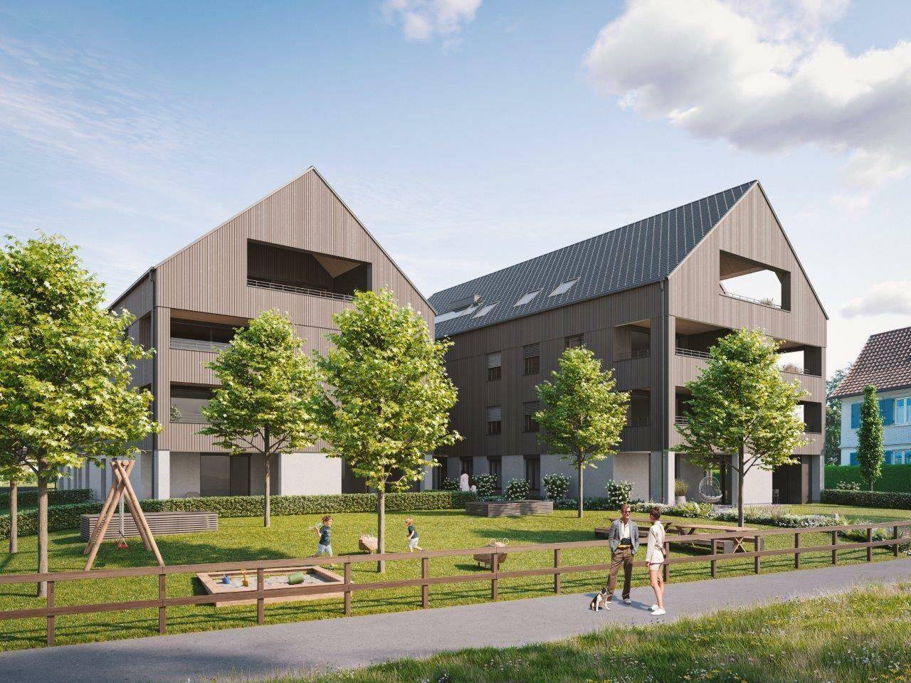 In idyllischer Lage entstehen 20 exklusive Eigentumswohnungen in zwei Baukörpern, die in Massiv- und Holzbauweise errichtet und durch ein gemeinsames Stiegenhaus verbunden werden.