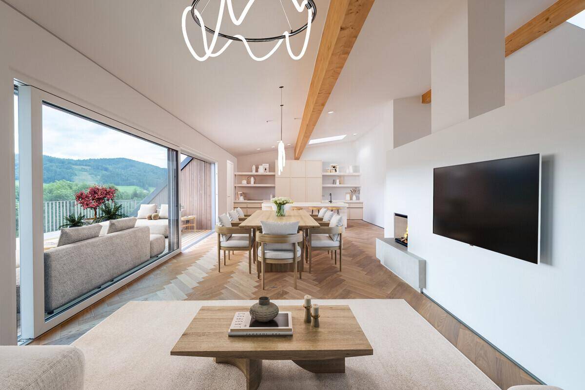 Der wahre Blickfang dieser Immobilie ist der offene Wohn-Essbereich mit über 50m2 mit hochwertigen Eichen-Echtholzparkettböden im Fischgrätmuster und einer beeindruckenden Raumhöhe. Hier treffen moderne Architektur und Funktionalität aufeinander – inklusive eines gemütlichen Kamins, der für eine warme Atmosphäre sorgt. Vom Wohnbereich aus gelangen Sie direkt auf die große Terrasse mit etwa 30 m², die einen fantastischen Süd-West-Blick über die Bäume hinweg auf den Irrsee bietet. Ein perfekter Ort zum Entspannen und Genießen.