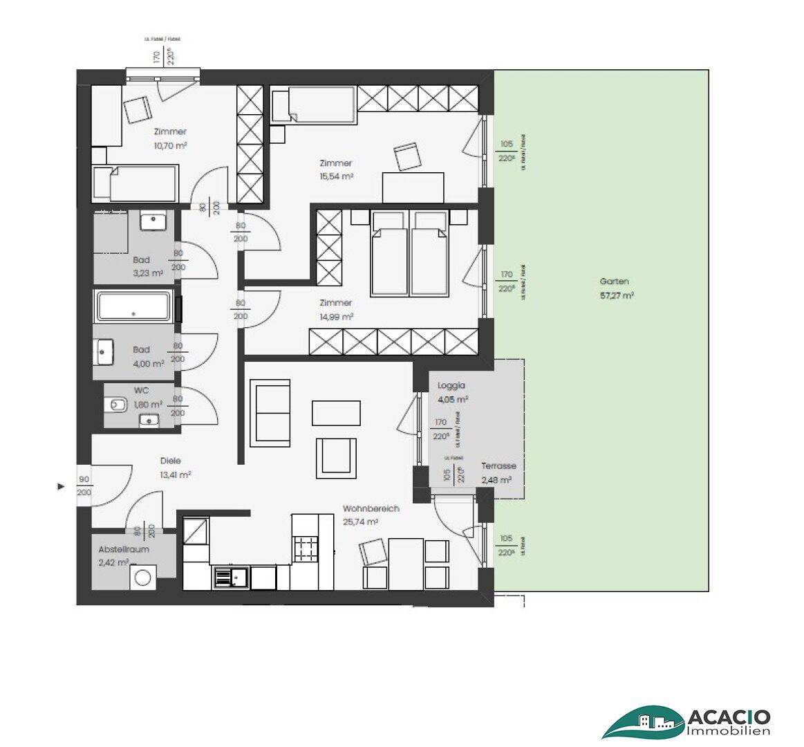 Über den Vorraum bzw. den Flur können alle Räume erreicht werden. Vomoffen gestalteten Koch-, Wohn- und Essbereich, welcher das Herzstück der Wohnung ist, gelangt man direkt auf die Terrasse bzw. in den Eigengarten (ca. 57 m2). Die Wohnung verfügt über 3 Schlafräume, welche natürlich auch als Kinder- oder Arbeitszimmer genutzt werden können. Die Wohnung ist mit einem separaten WC sowie zwei Badezimmern ausgestattet. Ein Badezimmer verfügt über Badewanne und Waschtisch, das zweite Badezimmer hat eine Dusche samt Waschtisch.
