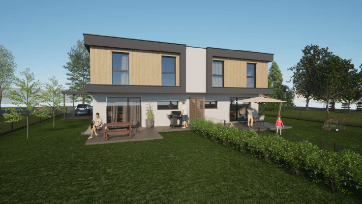 Jede Doppelhaushälfte verfügt über eine eigene, südseitig ausgerichtete Terrasse, die direkt vom Wohnbereich aus zugänglich ist – der perfekte Ort für entspannte Stunden im Freien, gemütliche Familienessen oder sommerliche Grillabende.