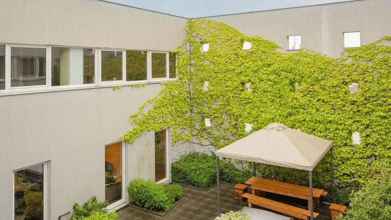 Die ruhige und begrünte Terrasse, im Innenhof schafft für die Mitarbeiter entspannte Pausen.