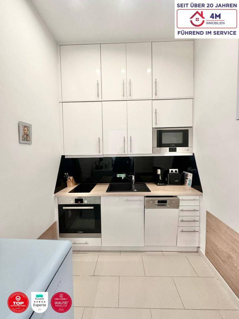 Die Wohnung wird mit Möbeln und Küchengeräten verkauft, wie auf den Bildern zu sehen ist.