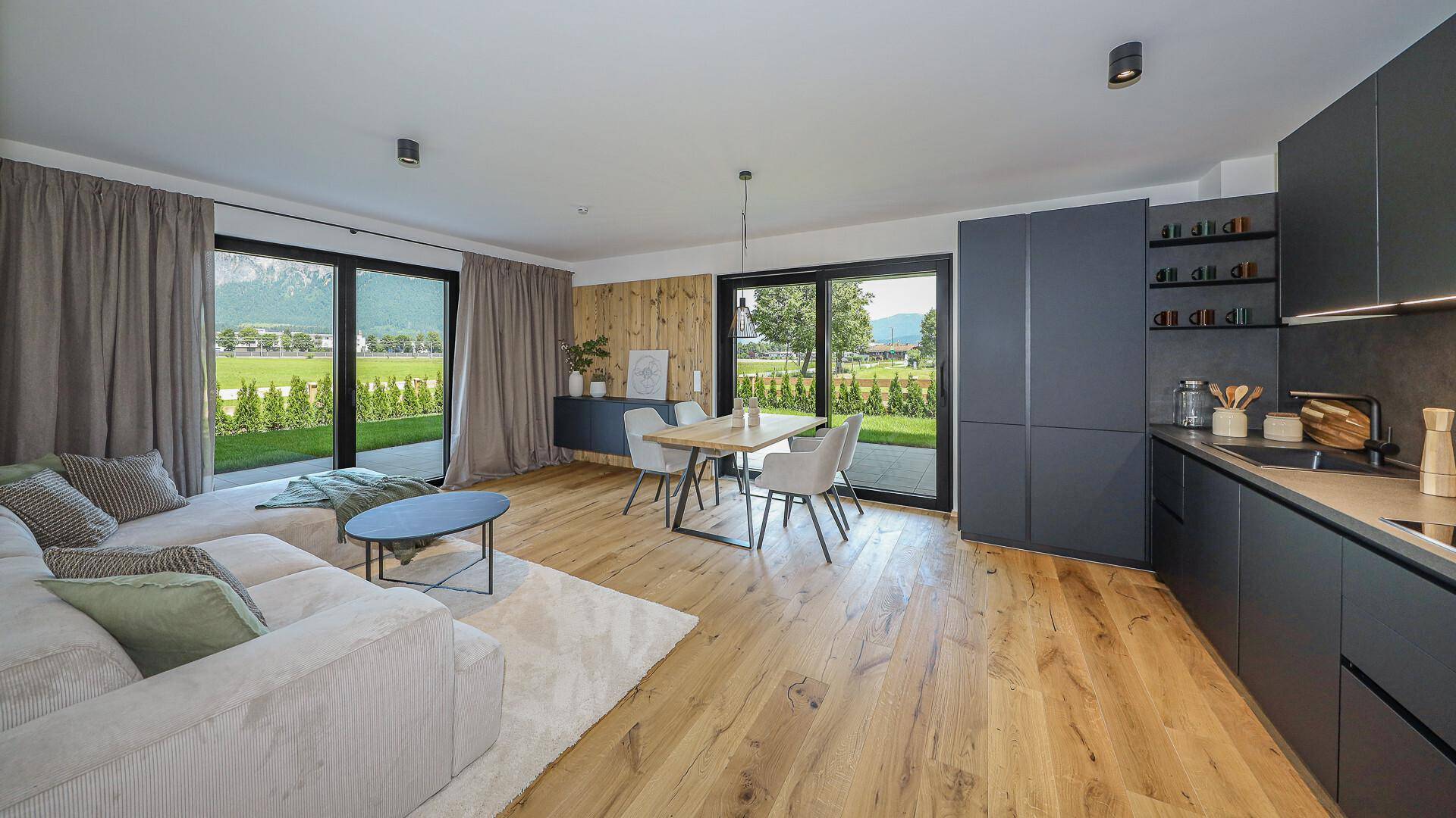 Die Wohnung teilt sich wie folgt auf: in die ca. 9 m² große Diele, welche alle Zimmer miteinander verbindet und Ihnen ausreichend Platz für Einbaukästen bietet. Dem großzügigen Wohn-Essbereich mit offener Küche, von welchem sich ein weitläufiger Ausblick auf das Massiv des Wilden Kaisers bietet. Weiters verfügt die Gartenwohnung über zwei geräumige und helle Schlafräume sowie über ein Badezimmer. Auch aus den beiden Schlafzimmer genießen Sie den Blick auf den Wilden Kaiser.