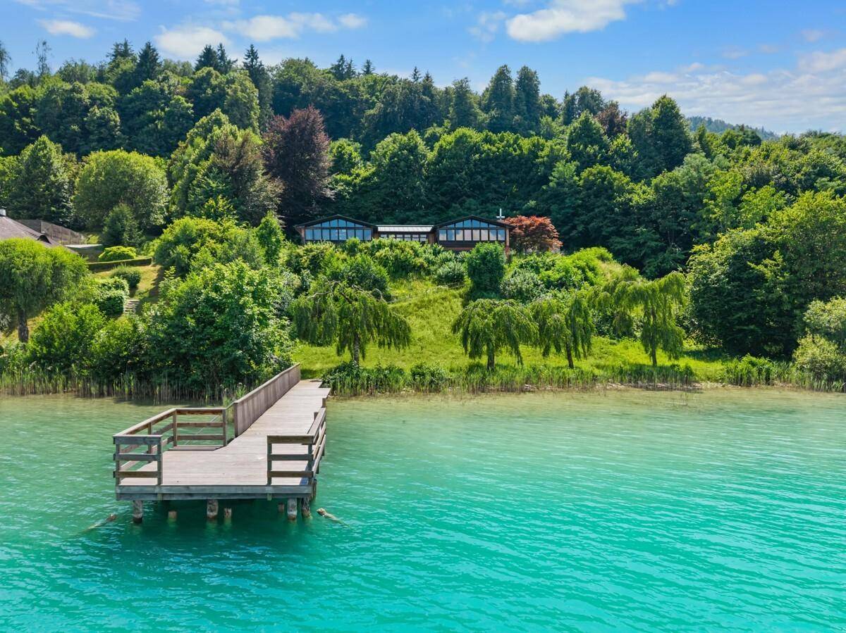 Eingebettet in einen sonnigen Garten mit altem Baumbestand bietet sich ein 180 Grad Panoramablick über den See auf die berühmte Halbinsel Maria Wörth mit der Wahlfahrtskirche bis nach Klagenfurt. Das unverbaute Gegenüber besticht durch den Blick ins Grüne.