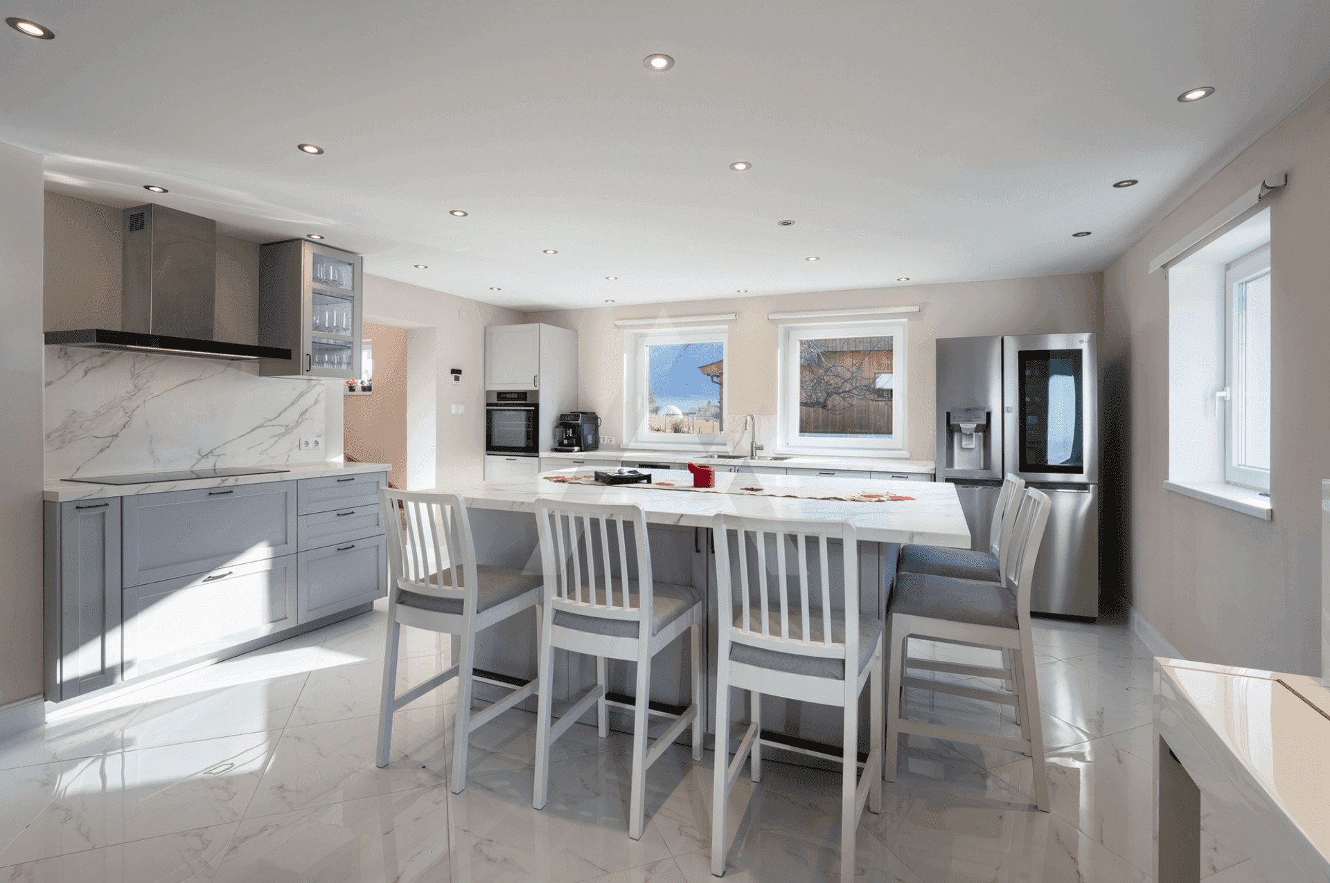 Schon beim Eintreten empfängt Sie ein großzügiger Eingangsbereich, der Sie sofort ankommen lässt. Das Erdgeschoss beeindruckt mit einem offenen Wohnbereich, hochwertiger Einbauküche und gemütlichem Essplatz – ideal für gemeinsame Abende mit Familie und Freunden. Ein Gäste-WC sowie der Heizraum mit Zugang zur Garage vervollständigen diese Etage.