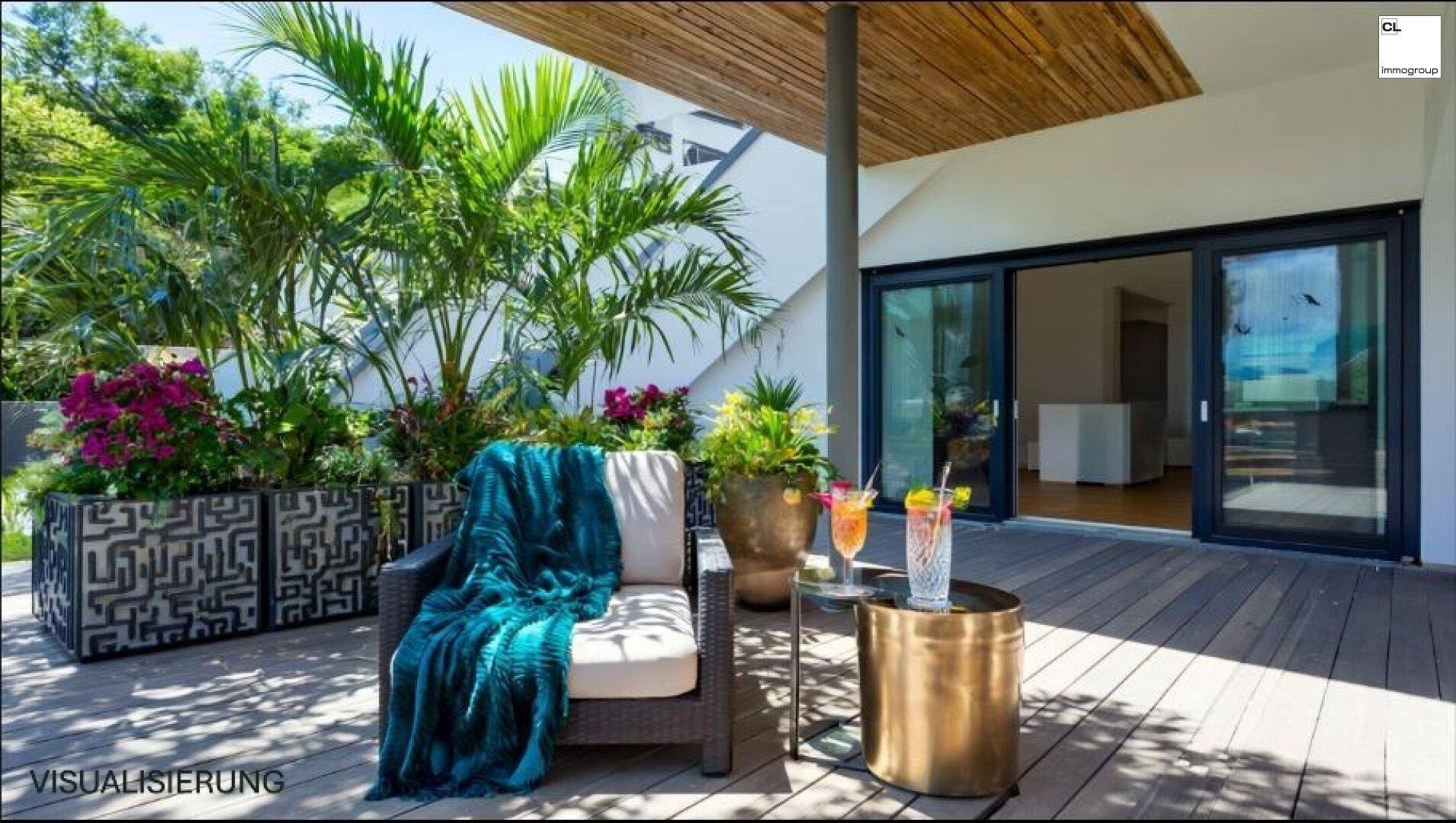 Große Schiebetüren verbinden den lichtdurchfluteten Wohnraum mit der ca. 40 m² großen Terrasse. Diese bietet ausreichend Platz für eine stilvolle Outdoor-Gestaltung mit Esstisch und Lounge-Bereich. Das Geländer wurde so konzipiert, dass ein Teilbereich aus transparentem Material besteht – so bleibt der spektakuläre Blick über den See und das umliegende Bergpanorama stets ungestört erhalten.