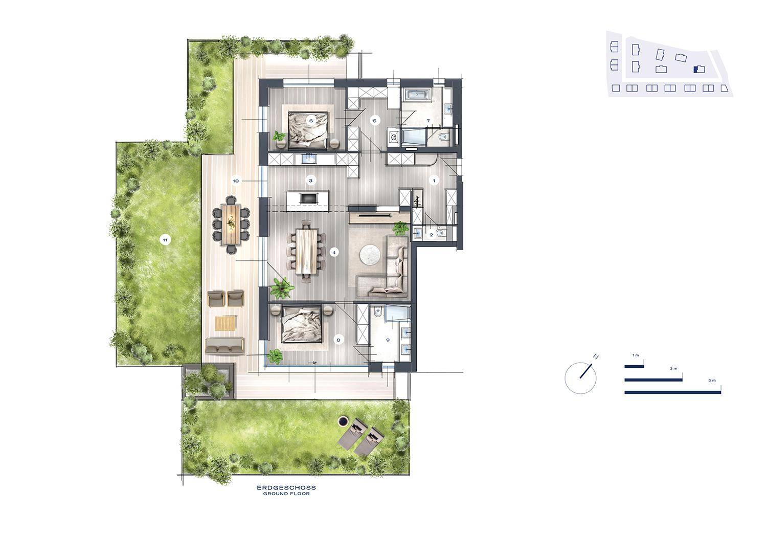 Ob als stilvoller Rückzugsort oder repräsentativer Lebensmittelpunkt – diese Wohnung vereint Großzügigkeit mit Raffinesse. Der offene Grundriss bietet Platz für Individualität, während die großzügigen Außenflächen Raum zum Durchatmen schaffen.