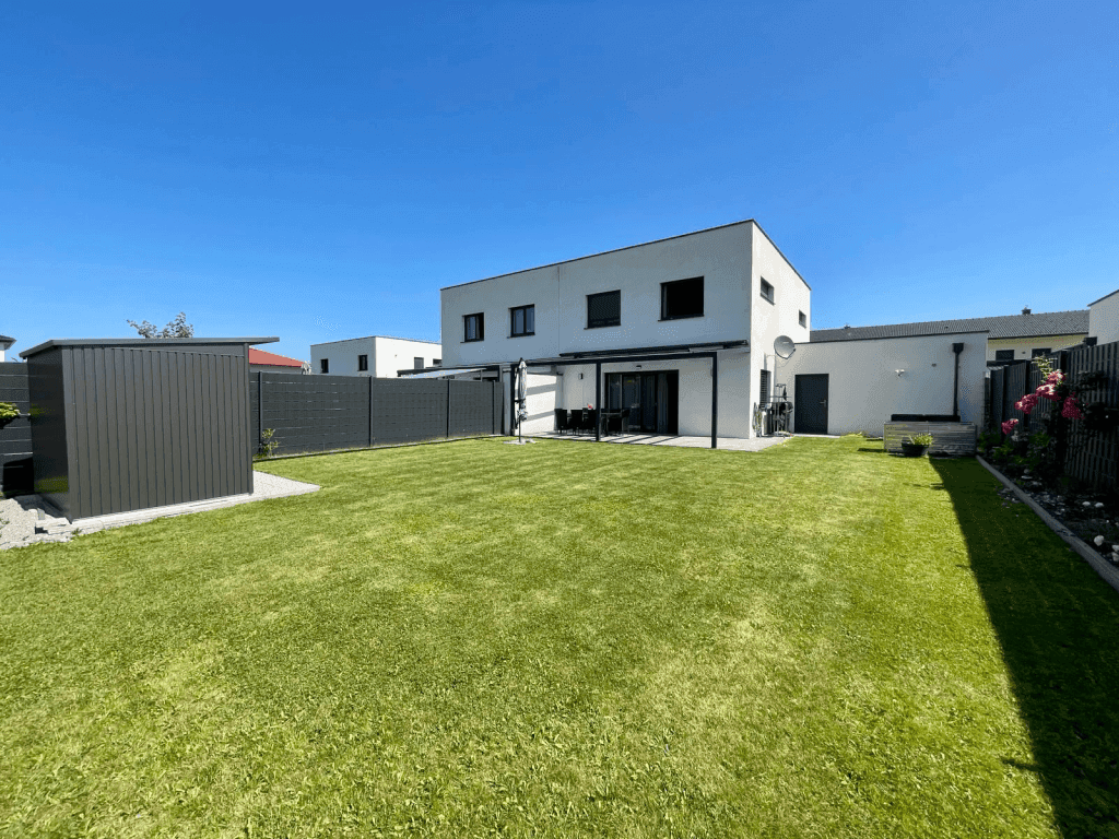 Ausstattungshighlights + Glasüberdachte Terrasse (ca. 20 m²) mit elektrisch ausfahrbarer Markise + Gepflegter Garten mit Gartenhütte von Biohort und zwei Hochbeete + Doppelgarage mit robustem Industrieboden + 4-5 zusätzliche Stellplätze auf dem asphaltierten Vorplatz + Fliegengitter an allen Fenstern + Wärmepumpe von Ochsner für effiziente Heizung und Warmwasser + Hochwertige Einbauküche mit Granit-Arbeitsplatte, Weinkühlschrank (zwei Temperaturzonen), Induktionskochfeld mit integriertem Lüftungssystem, Backofen mit Mikrowellenfunktion, Miele-Geschirrspüler mit AutoOpen-Trocknung, großer Kühlschrank mit ausfahrbarer Getränkelade + Schnelles Internet über Glasfaser