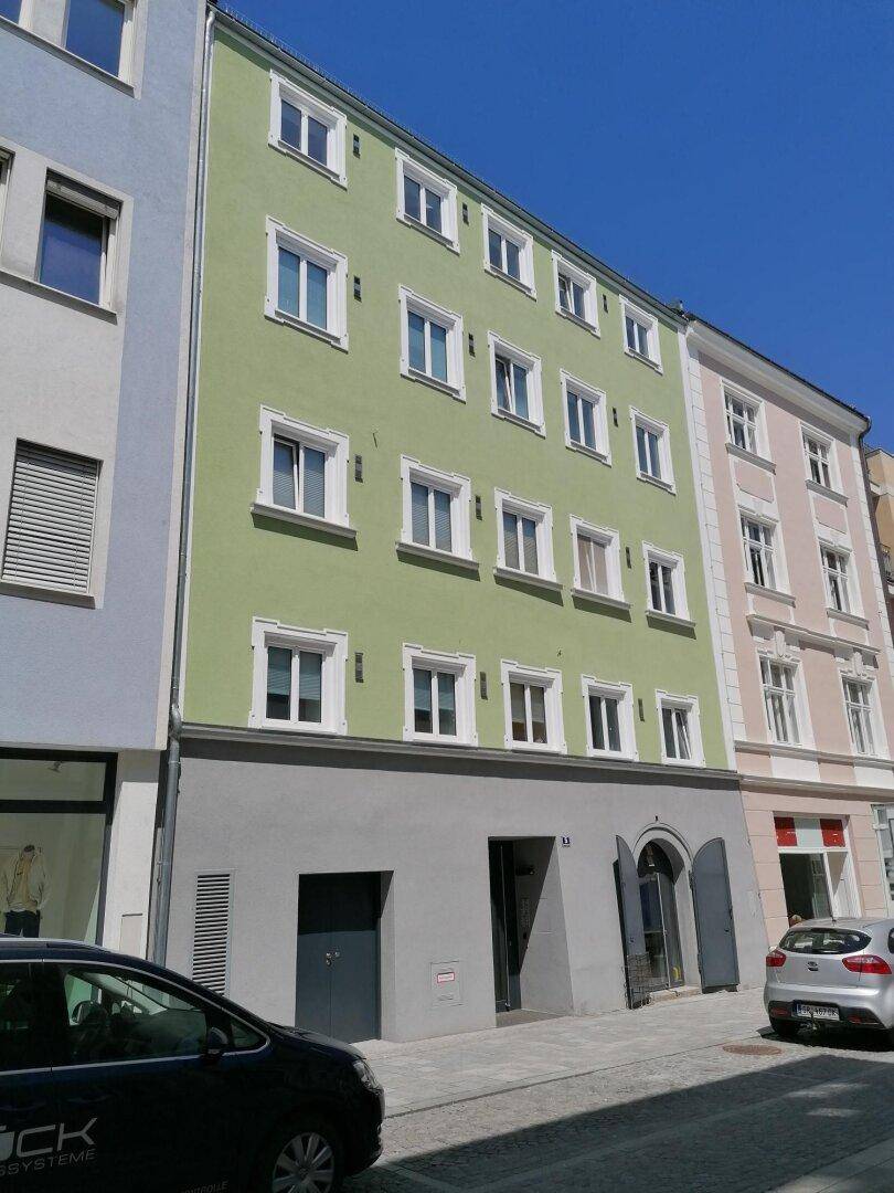 Im Erdgeschoss befinden sich die Allgemeinflächen für beide Häuser (Zugang, Aufzug, Heizung, Müll usw.). Das Stiegenhaus mit dem Lift und der Arkadengang sind auch der Zugang für die Liegenschaft Hauptplatz 43.