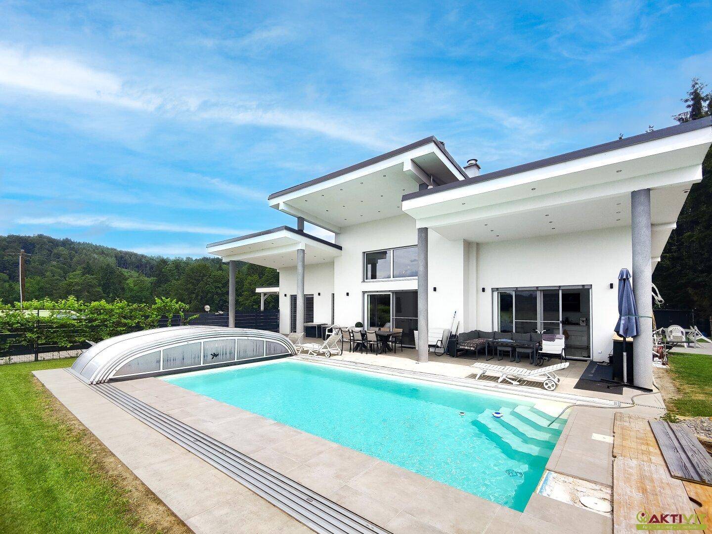 Zu den Highlights zählen der große Pool, hochwertige Ausstattung sowie die moderne Energieversorgung mit Photovoltaik.