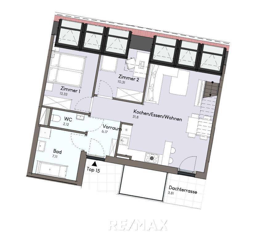 Diese durchdacht geplante 3-Zimmer-Wohnung überzeugt mit einer modernen Raumaufteilung, großzügigen Außenflächen und einem zusätzlichen Dachraum, der vielseitig nutzbar ist – etwa als Büro, Hobbyraum oder Stauraum.