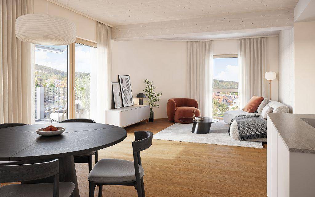 Die Ausstattung überzeugt durch sehr hohe Qualität: Dazu gehören ein Eichen-Parkettboden, edles Feinsteinzeug im Format 30x60, Holz-Holz-Fenster mit 3-fach-Isolierverglasung, ein elektrischer Sicht- und Sonnenschutz sowie eine kontrollierte Wohnraumlüftung. Im Sommer können die Wohnungen über die Fußbodenheizung etwas kühler temperiert werden. Die Dachgeschoß-Wohnungen bekommen eine elektrische Markise, mit Windwächter.