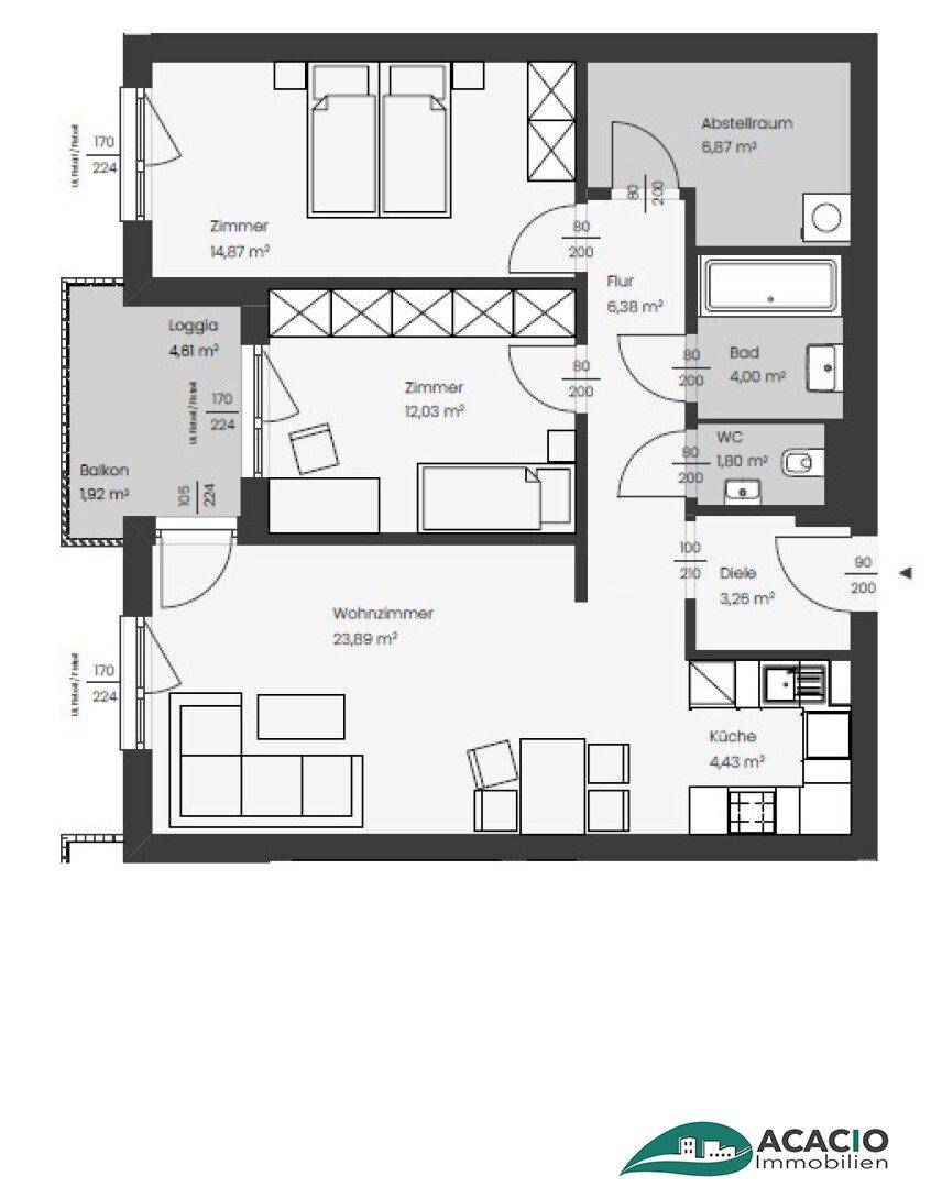 Über den Vorraum bzw. den anschließenden Gang sind alle Räume zentral zu erreichen. Der offen gestaltete Koch-, Wohn- und Essbereich bildet das Herzstück der Wohnung - von hier gelangen Sie auch auf die (von der angrenzenden Wohnung uneinsehbare) Loggia. Die Wohnung verfügt darüber hinaus über zwei Schlafräume, einen großzügigen Schrankraum, ein Badezimmer mit Wanne und Waschtisch und natürlich über ein separates WC.