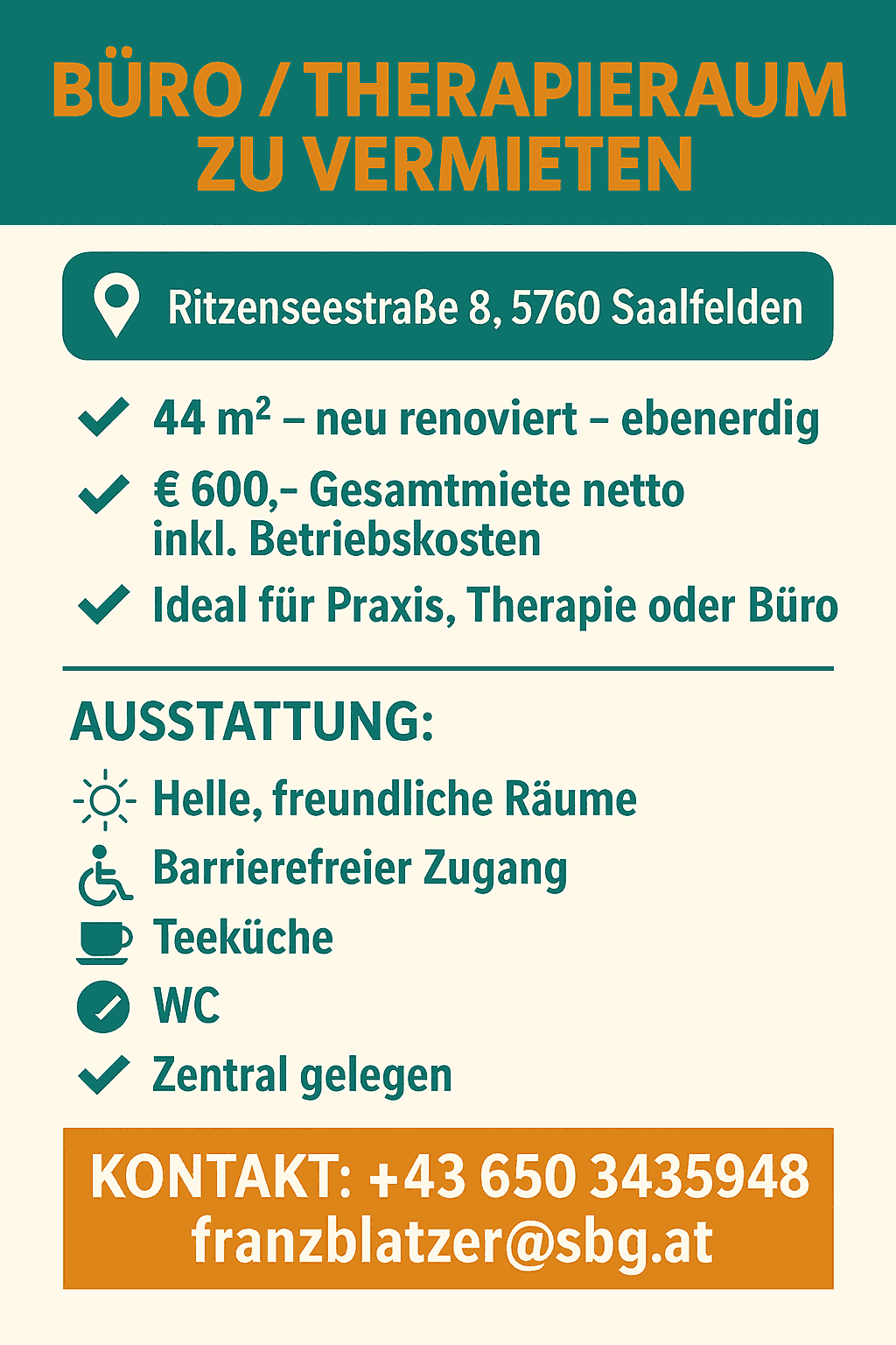 Die neu renovierten und ebenerdigen Räume eignen sich ideal als Praxis, Therapieräume oder Büro. Die Einheit besticht durch ihre zentrale Lage in Saalfelden - mit Nähe zu öffentlicher Infrastruktur und Parkmöglichkeiten sowie die angenehme und freundliche Atmosphäre.