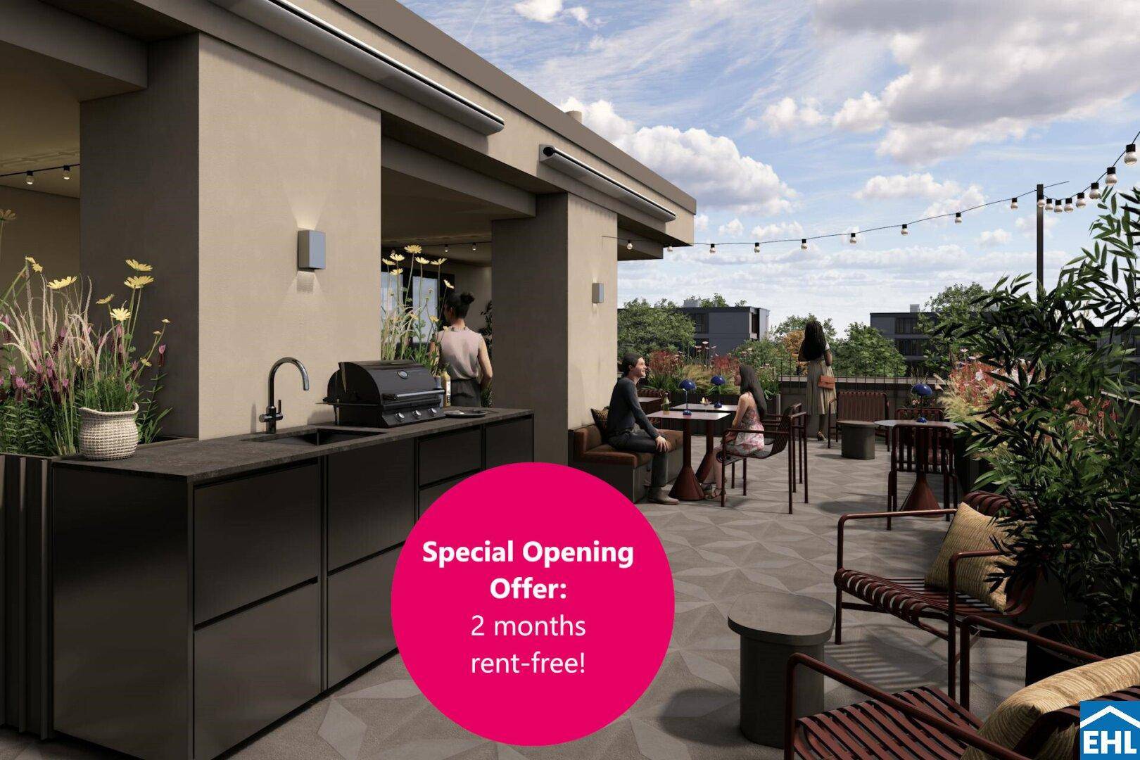 Neben Ihrem privaten Wohnbereich profitieren Sie von großzügigen, hochwertig gestalteten Gemeinschaftsflächen, die weit über das Übliche hinausgehen: Ob konzentriertes Arbeiten im Co-Working Space, entspannte Stunden in der stilvollen Bewohner Lounge oder aktive Pausen im hauseigenen Fitness- und Yogastudio – hier finden Sie genau den Ort, den Sie gerade brauchen. Für gesellige Momente stehen Ihnen ein exklusiver Private-Dining-Raum, ein Gaming Room und ein einladender Kinosaal zur Verfügung. Wer kreativ tätig werden möchte, findet im professionell ausgestatteten Podcast Raum den idealen Rahmen. Ein besonderes Highlight ist die grüne Dachterrasse mit Gemeinschaftsgarten – ein Rückzugsort über den Dächern der Stadt, der zum Entspannen, Gärtnern und Genießen einlädt.