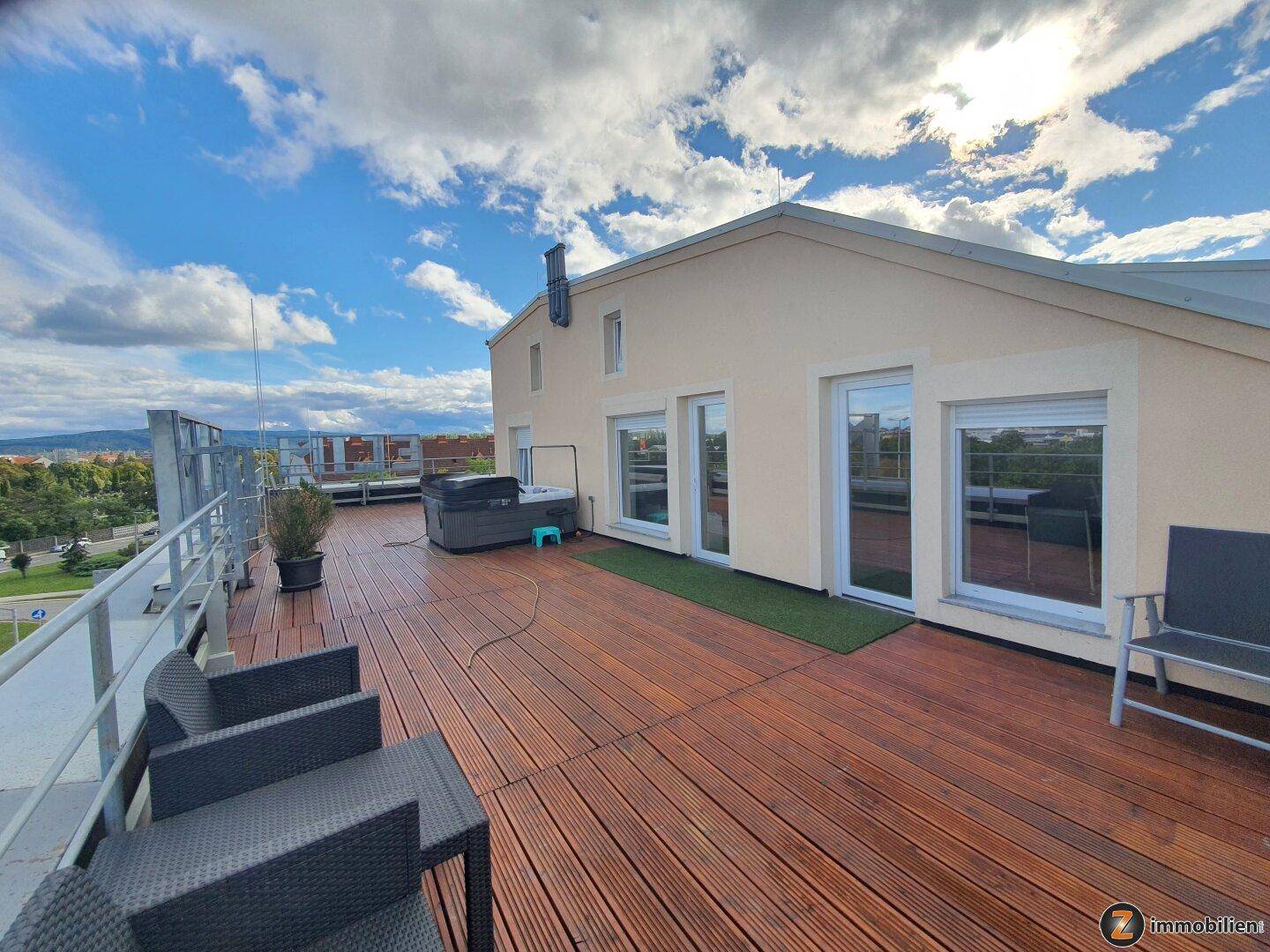 Barrierefreie Wohnung mit eigenem Wohngeschoss und Liftausstieg. Die Wohnung besticht durch ihre hochwertige Ausstattung und Raumaufteilung. Aufteilung: möblierte Küche mit Bar, Essbereich, TV und Ausgang zur Dachterrasse. Das Wohnzimmer und die beiden Schlafzimmer - auf Wunsch teilmöbliert, haben ebenfalls einen Zugang zur Terrasse. Bad mit Wanne und WC, Abstellraum, WC und Vorraum. In den Schlafzimmern sind jeweils Zwischendecken eingezogen - für weitere Schlafmöglichkeiten oder Stauraum. Ausstattung: elektr. Rollo, 3 Scheiben-Isolierverglasung, Klimaanlagenvorbereitung, Dachterrasse mit Whirlpool, Parkett, Fliesen und Marmorböden. Autoabstellplatz inklusive. Schulen, Kindergarten, Bahn, Bus und Einkaufsmöglichkeiten in Kürze erreichbar. BK. ca.250.-