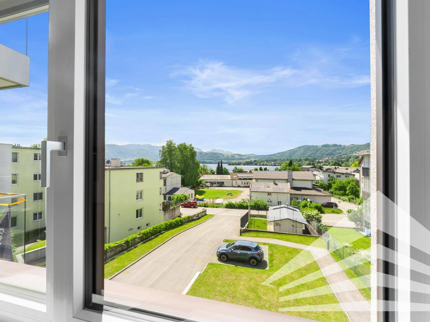 Vom Wohn-/Esszimmer mit Küche gelangen Sie auf die sonnige Loggia (ca. 15 m²) - genießen Sie den wunderschönen Blick auf den See und Schloß Ort! Auch das Hauptschlafzimmer verfügt über einen Ausgang zum separaten Mini-Balkon mit Seeblick.