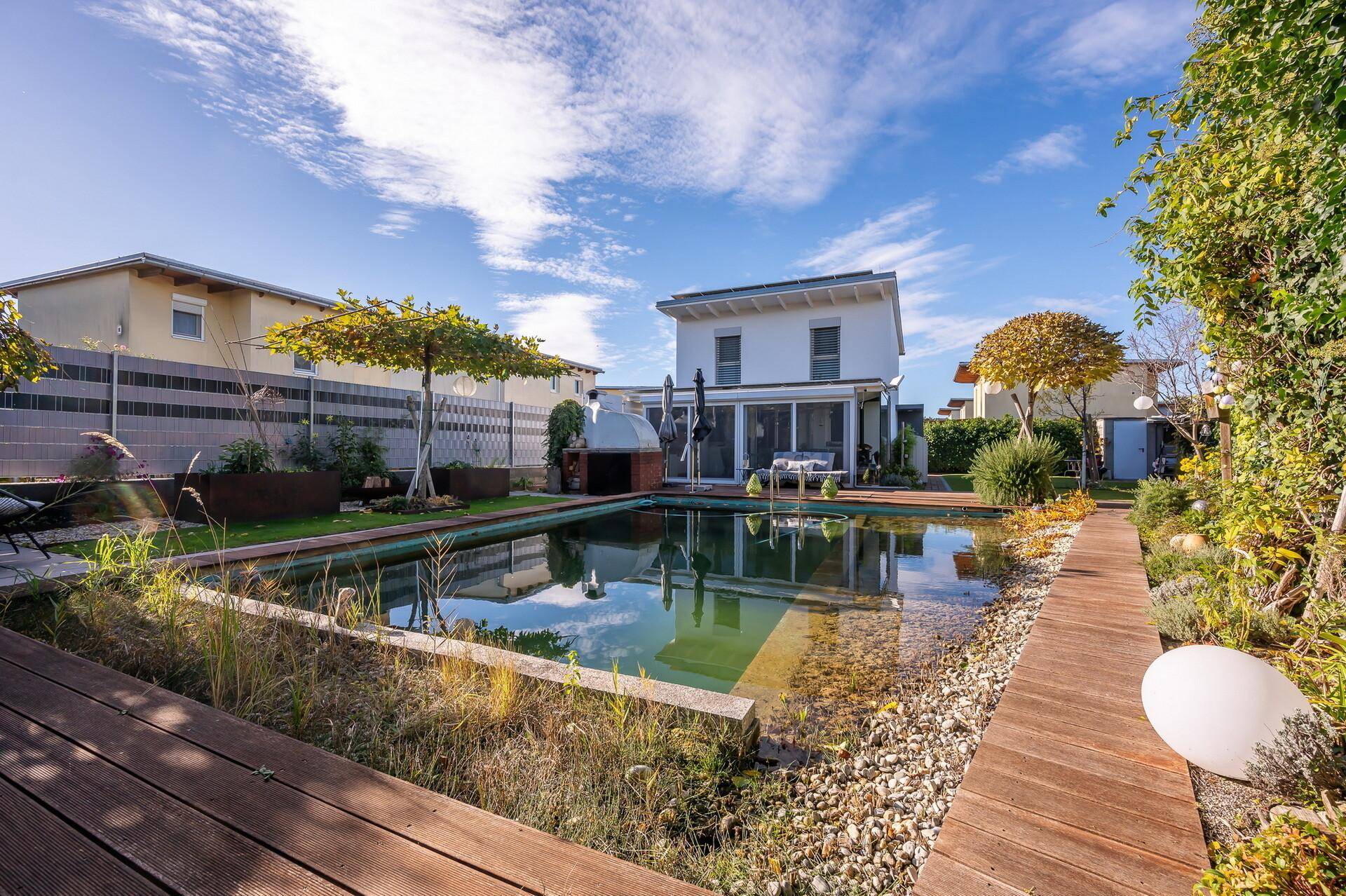 Highlights: • Wohnfläche ca. 62,5 m² + 72,3 m² Wohnkeller • Grundstücksgröße ca. 431 m² • Schwimmteich mit Regenerationszone & Holzterrassen • Photovoltaikanlage (11,5 kWp), Thermosolar & Wärmepumpe • Smarthome-Steuerung, E-Ladestation & Brunnenanlage • Hochwertiger Parkettboden, Maßküche, Wintergarten • eigener Brunnen