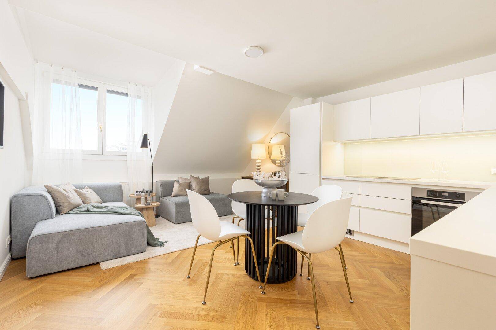 Gleich daneben befindet sich wohl das Herzstück der Wohnung - die mit 22,80 m² große, perfekt modern gestaltete, Wohnküche. Hochwertige Markengeräte sowie zeitlose Oberflächen unterstreichen die wertvolle Ausstattung der schön angelegten und in den Essbereich integrierten Küche. Der Wohnbereich ist mit der Küche verbunden und bietet ausreichend Platz, um es sich gemütlich einzurichten. So finden die neuen Eigentümer genügend Platz, um eine bequeme Couch, einen Esstisch sowie TV-Möbel zu integrieren.